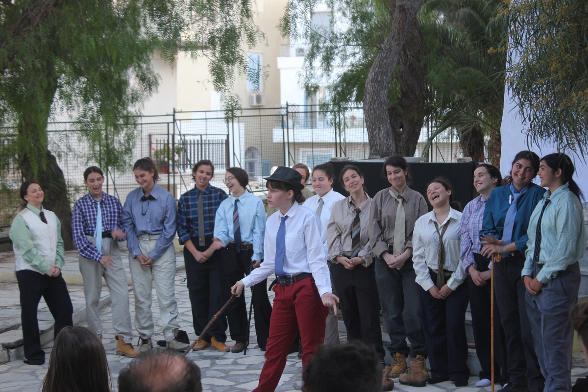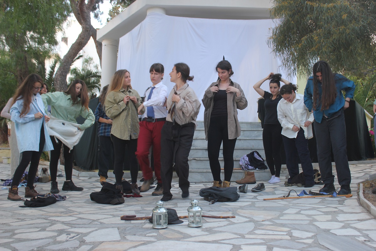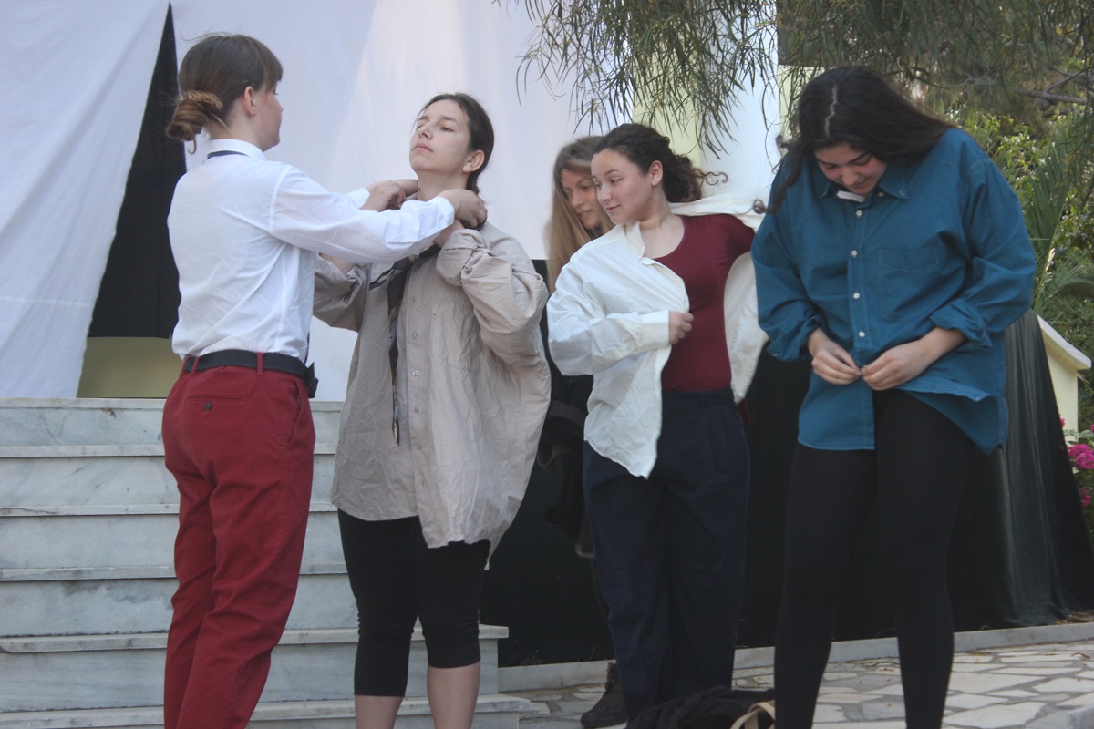 Στην παράσταση έπαιξαν οι μαθητές: Σελεστίνη Συνοδινού, Μαριαλένα Τσαντήλα, Αντώνης Κουβαλάκης, Νικήτας Χρήστου, Άννα Κορωναίου, Μαριαλένα Τσαντήλα, Αντωνία Χαλαβαζή, Ναυσικά Γκοτζαμάνη, Αντωνία Ρηγούτσου, Μαρία Στεφάνου, Μίνα Κατσάβη, Κατερίνα Μπούρα, Μυρσίνη Τζαβάρα, Ελπίδα Ξαγοράρη, Κατερίνα Μπούρα, Έλενα Μπραζόλα – Μπαχαράκη & Ελίζα Καζόλη. Κορυφαίες στον χορό η Μυρσίνη Τζαβάρα και η Ελπίδα Κόνταρη. Το έργο παρουσιάστηκε με δύο διαφορετικές διανομές.