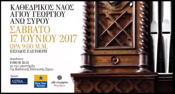 Με μία ξεχωριστή συναυλία στην οποία θα “πρωταγωνιστούν” οι ήχοι εκκλησιαστικού οργάνου και πνευστών μουσικών οργάνων στον Καθεδρικό Ναό του Αγίου Γεωργίου στην Άνω Σύρο επέλεξε το FORUM 20.21 να κλείσει την “αυλαία” της διαδρομής του, αφού εκλείπει πλέον, ο κύριος σκοπός της σύστασής του, που αφορούσε στη διεκδίκηση του τίτλου της Πολιτιστικής Πρωτεύουσας της Ευρώπης για το έτος 2021.