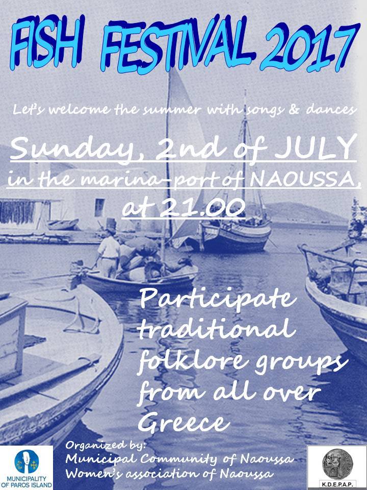 Η Κοινωφελής Δημοτική Επιχείρηση Πολιτισμού και Αθλητισμού Πάρου προσκαλεί στην Γιορτή του Ψαριού, που θα πραγματοποιηθεί στο λιμάνι της Νάουσας, την Κυριακή, 2 Ιουλίου, στις 21:00.