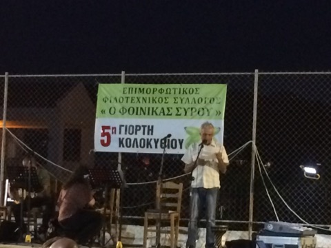 Ο πρόεδρος του Συλλόγου, άνοιξε την εκδήλωση, μιλώντας για την αφορμή της καλοκαιρινής αυτής γιορτής, που δεν είναι άλλη, από την ποιότητα και φήμη του Συριανού κολοκυθιού, το οποίο έχει ταξιδέψει σε όλη τη χώρα, γεμίζοντας τα ελληνικά πιάτα. Επίσης, μίλησε για τη δουλειά του Συλλόγου, να κρατά τους σπόρους για τη σπορά, καθώς επίσης και για την ενεργή ανάμειξη των νέων, από όλο το νησί, που δραστηριοποιούνται σε αυτή τη διαδικασία, από την φύτευση του πρώτου σπόρου, έως και τη συγκομιδή.