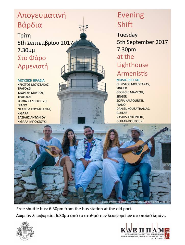 Ο Δήμος Μυκόνου και η Κοινωφελής Δημοτική Επιχείρηση διοργανώνουν την «3η Απογευματινή Βάρδια» στον Φάρο Αρμενιστή της Μυκόνου την Tρίτη 5 Σεπτεμβρίου 2017.