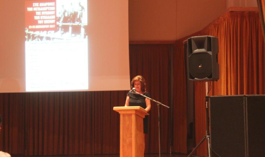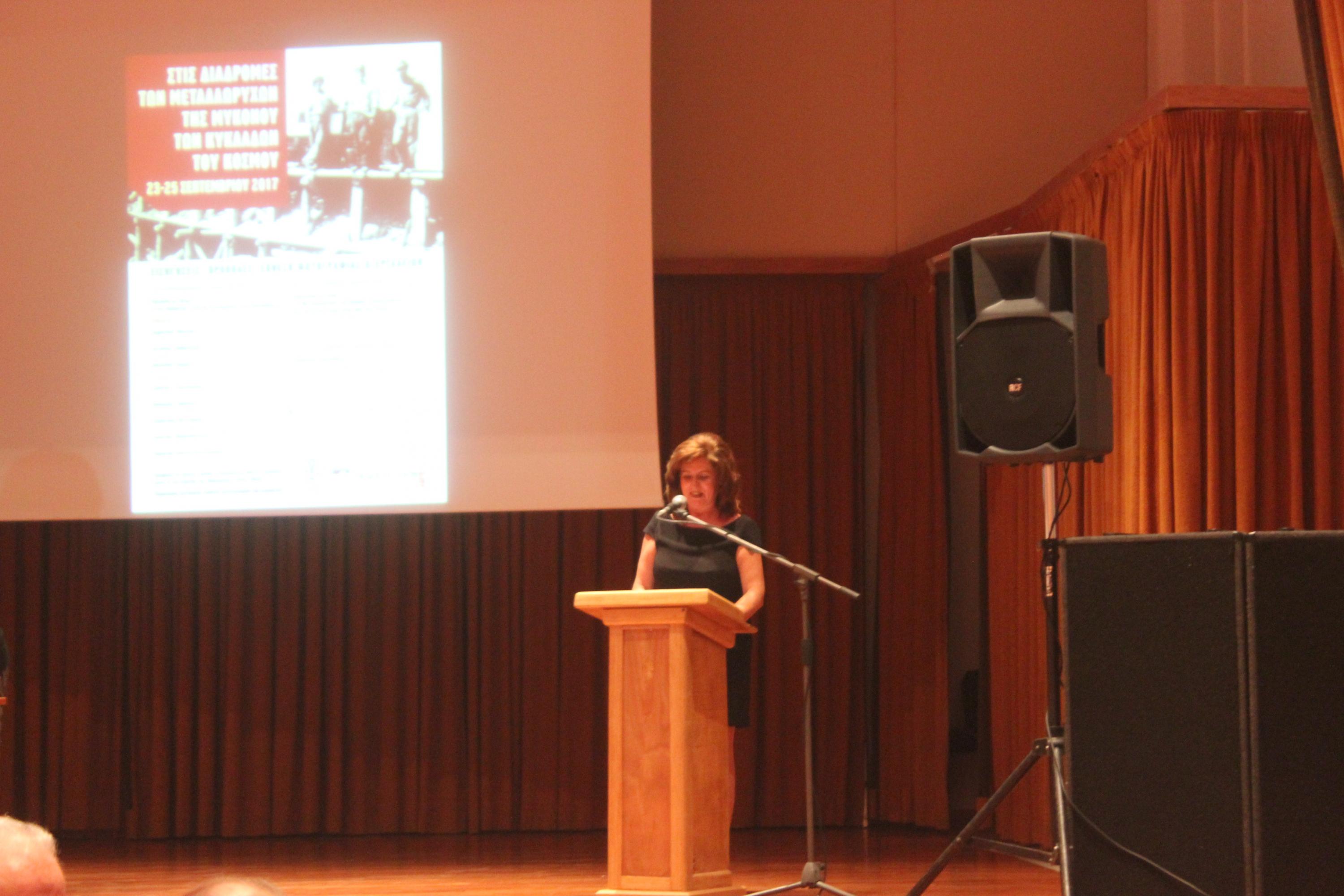 Την εκδήλωση χαιρέτισε η εκπρόσωπος του Ελληνικού Κέντρου Τέχνης και Πολιτισμού, Βάσω Κιούση, η οποία αναφέρθηκε στη σημαντική προσπάθεια που καταβάλλεται από αυτό για την ανάδειξη της ιστορίας των μεταλλείων – ορυχείων και των ανθρώπων τους, καθώς και την προβολή του καθοριστικού ρόλου τους στην οικονομική ανάπτυξη της χώρας και στη διαμόρφωση του κοινωνικού ιστού των περιοχών, όπου αυτά λειτούργησαν.