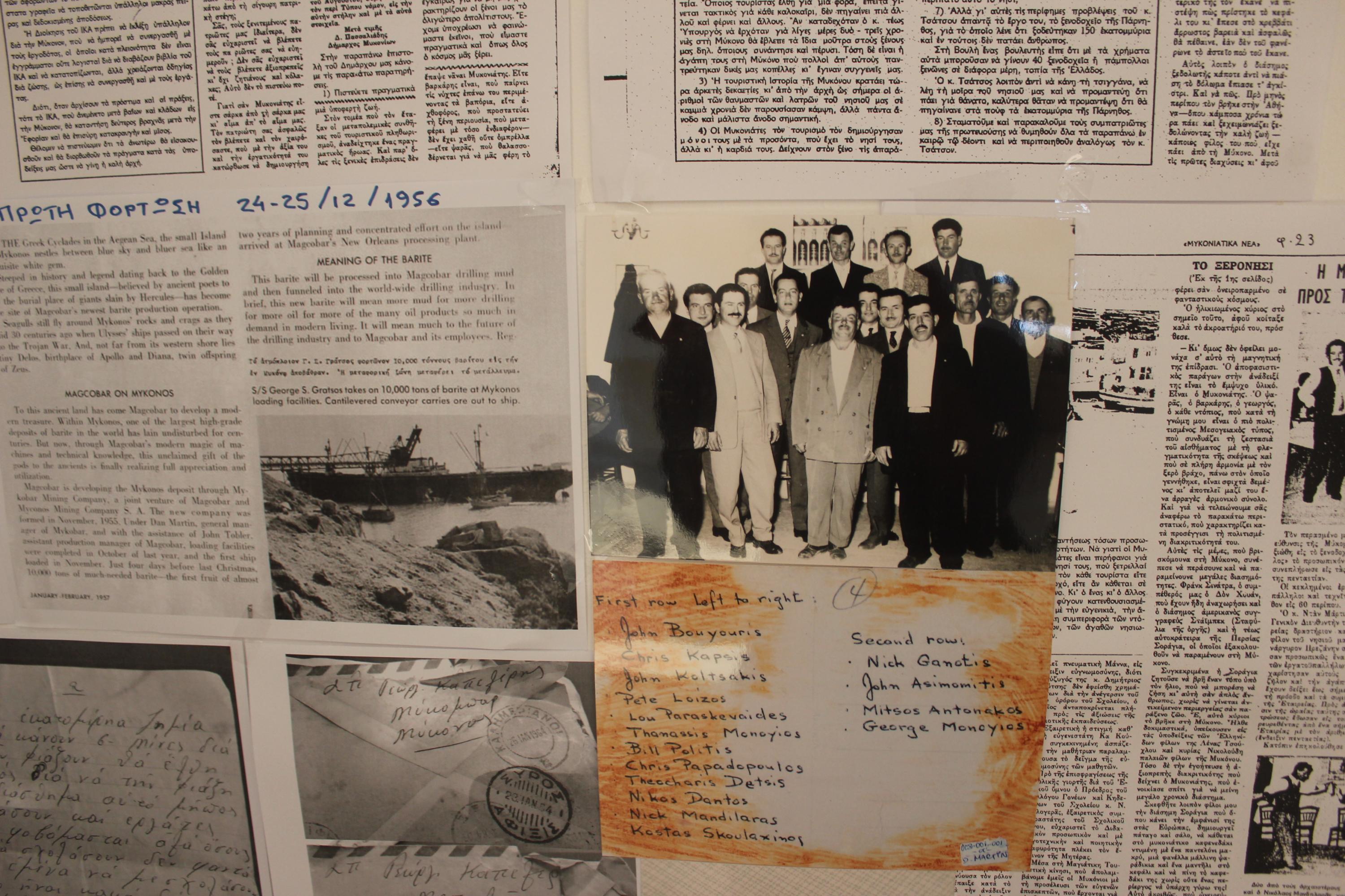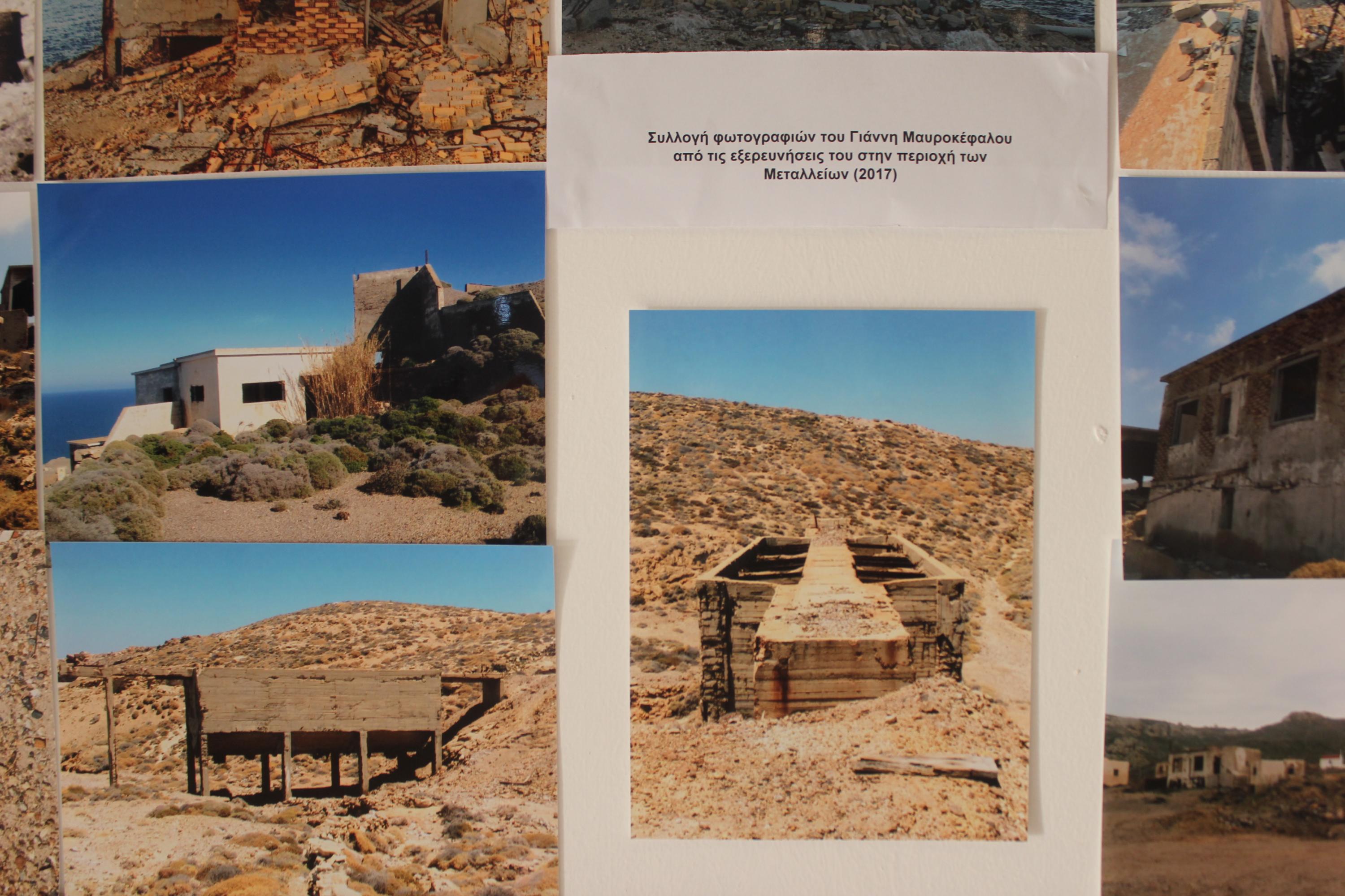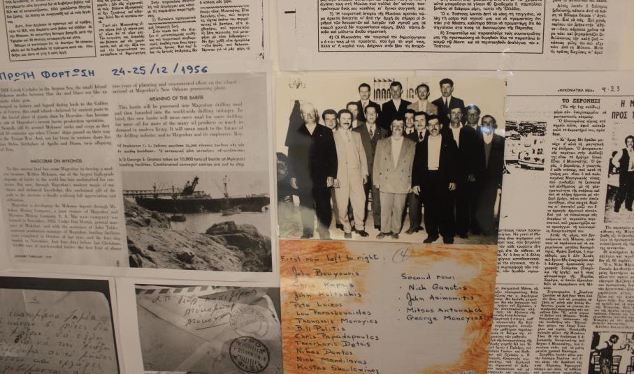 Στο πλαίσιο των τριήμερων εκδηλώσεων στο Γρυπάρειο Πολιτιστικό Κέντρο παρουσιάζεται αρχειακό υλικό από την εποχή της λειτουργίας του Μεταλλείου Βαρίτη της Μυκόνου της ΜΥΚΟΜΠΑΡ Α.Ε. (1955-1983), που συνέλεξε η κ. Βουλγαράκη. Επιπλέον, εκτίθενται φωτογραφίες του Γιάννη Μαυροκέφαλου από τις εξερευνήσεις του στην περιοχή των Μεταλλείων, καθώς και αντικείμενα, χρήσης κατά τη λειτουργία των Μεταλλείων που ευγενώς παραχώρησαν οι: Τάκης Σκουλάξινος, Γιάννης Μαυροκέφαλος και Μιχάλης Ασημομύτης-Στάης.