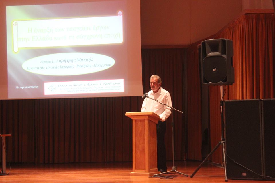 Οι ομιλίες ξεκίνησαν με τον Ερευνητή Τοπικής Ιστορίας Ραφήνας – Πικερμίου, Δημήτρη Μακρή -γιο μεταλλωρύχων-, ο οποίος επικεντρώθηκε στην αρχή των υπογείων έργων στην Ελλάδα και τους νεότερους χρόνους».