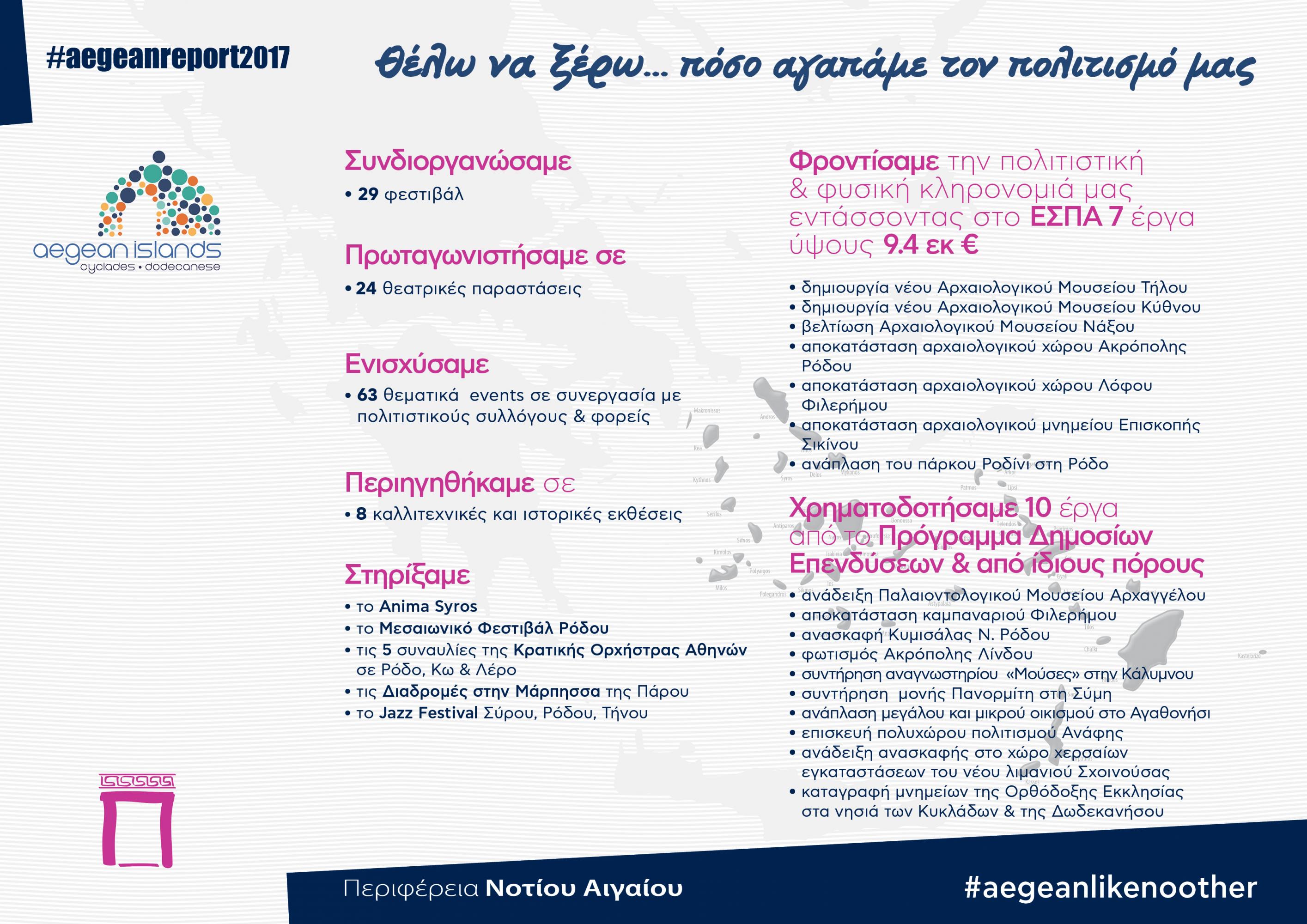 Η εξέχουσα θέση που κατέχει ο πολιτισμός στις προτεραιότητες της Περιφερειακής Αρχής, είχε ως αποτέλεσμα, και το 2017, ένα μεγάλο μέρος από ίδιους πόρους της Περιφέρειας καθώς και από το Επιχειρησιακό Πρόγραμμα «Νότιο Αιγαίο 2014 – 2020» να διατεθεί για έργα πολιτισμού στα νησιά, παράλληλα με την οργάνωση, συνδιοργάνωση και στήριξη μεγάλου αριθμού πολιτιστικών εκδηλώσεων, υψηλής ποιότητας, σε στενή συνεργασία με τους πολιτιστικούς φορείς των νησιών.