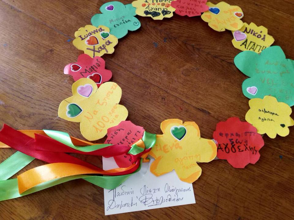 Οι μικροί φίλοι της Βιβλιοθήκης έφτιαξαν λουλούδια από χαρτί με τα ονόματα και τις ευχές τους και τα χρησιμοποίησαν για να συνθέσουν πρωτότυπα στεφάνια αγάπης, τα οποία χάρισαν στους τροφίμους του οίκου ευγηρίας. Στη συνέχεια, μικροί και μεγάλοι είχαν τη χαρά να ακούσουν όμορφα παραμύθια από την κ. Ρούσσου.