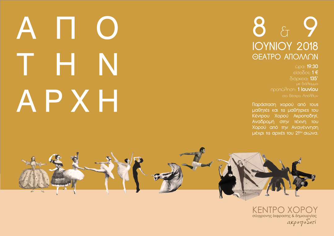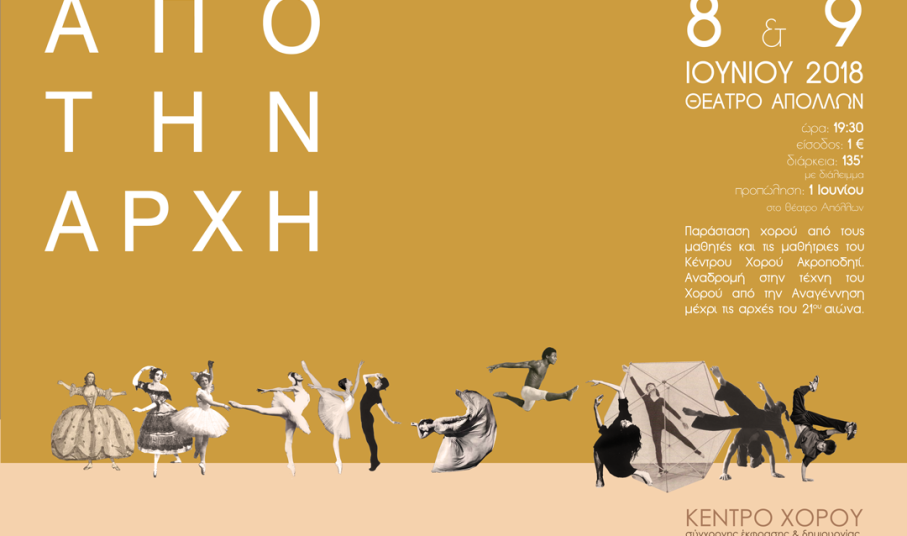 Με αφορμή τη λήξη των φετινών μαθημάτων στο Κέντρο Χορού Ακροποδητί, οι μαθητές και οι μαθήτριες θα παρουσιάσουν στις 8 και 9 Ιουνίου στο Θέατρο Απόλλων την χορευτική παράσταση «Από την Αρχή», μια αναδρομή στην τέχνη του Χορού, από την Αναγέννηση μέχρι τις αρχές του 21ου αιώνα. Το έργο συμπεριλαμβάνει ρεπερτόριο από έργα σημαντικών χορογράφων και προβολή σχετικού οπτικοακουστικού υλικού.