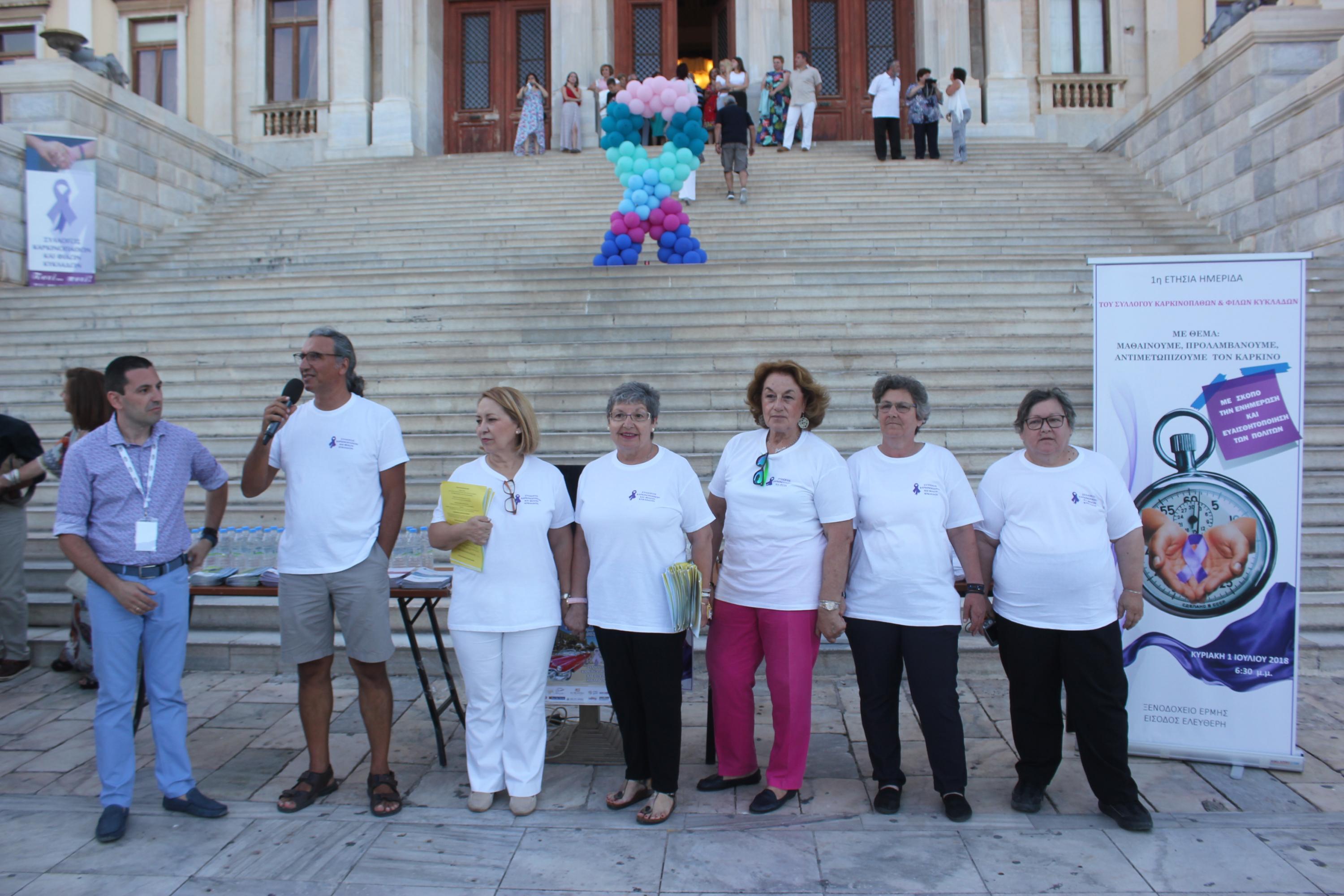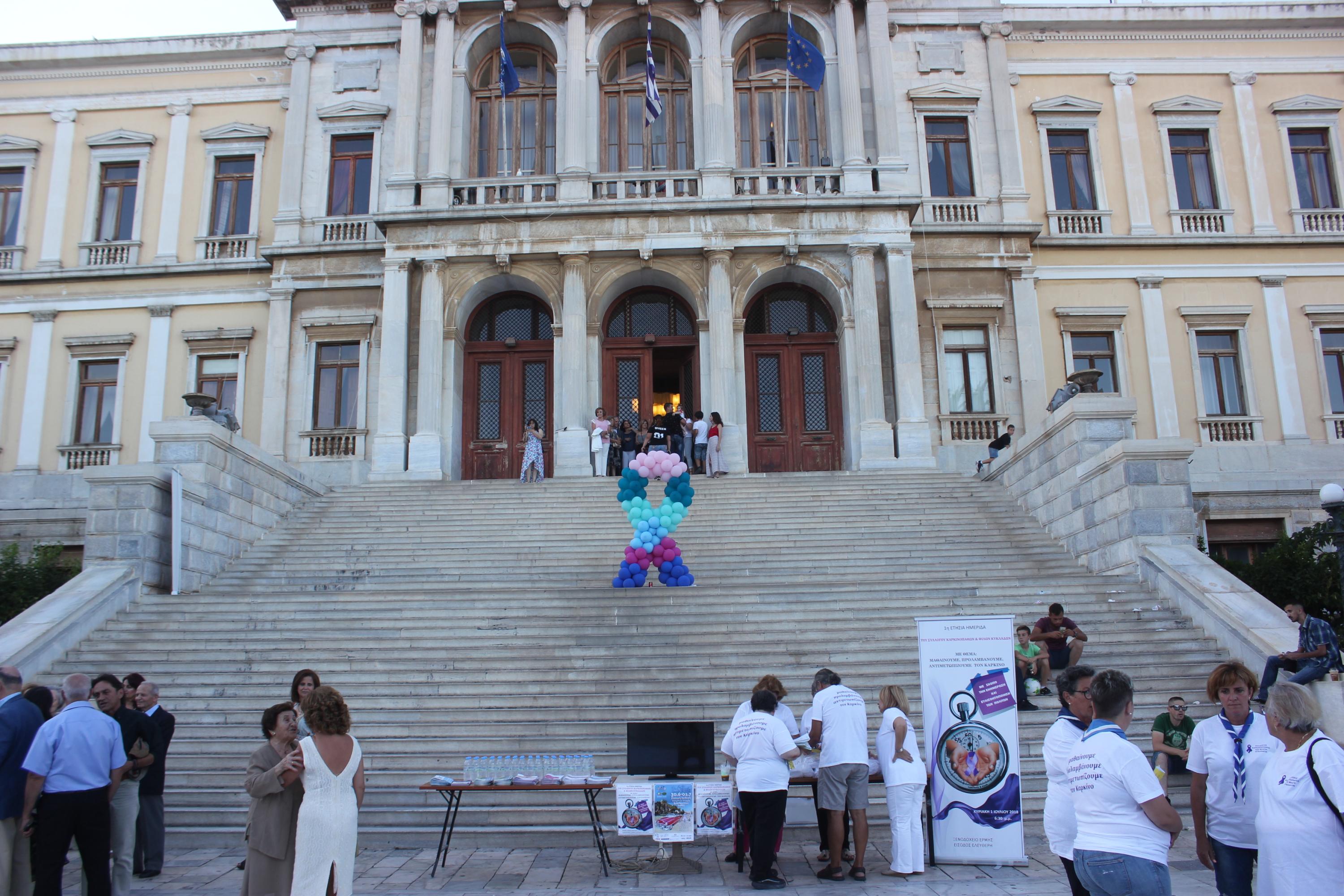 Τους επισκέπτες της Πλατείας Μιαούλη καλωσόρισε με τη σειρά του το διοικητικό συμβούλιο του Συλλόγου Καρκινοπαθών και Φίλων Κυκλάδων, ο οποίος σε συνεργασία με την Περιφερειακή Εφορεία Κυκλάδων και τους Προσκόπους Σύρου πραγματοποίησε στην ιστορική πλατεία του νησιού παιχνίδια για παιδιά και γονείς.