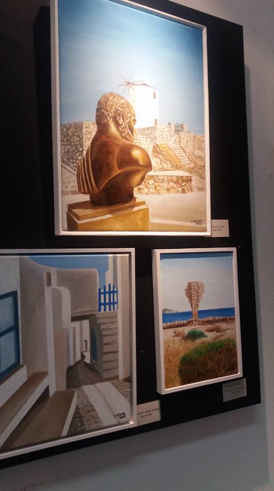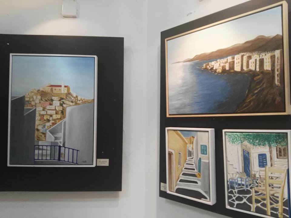 Ανάμεσα στους 30 πίνακες που παρουσιάζονται στο Πνευματικό Κέντρο Άνω Σύρου, μπορεί κανείς να δει, μεταξύ άλλων, το Δημαρχείο, το στενάκι που οδηγεί προς το ξενοδοχείο «Πλόες, το Καρνάγιο και τα Βαπόρια (κατεβαίνοντας προς τον Άγιο Νικόλαο).