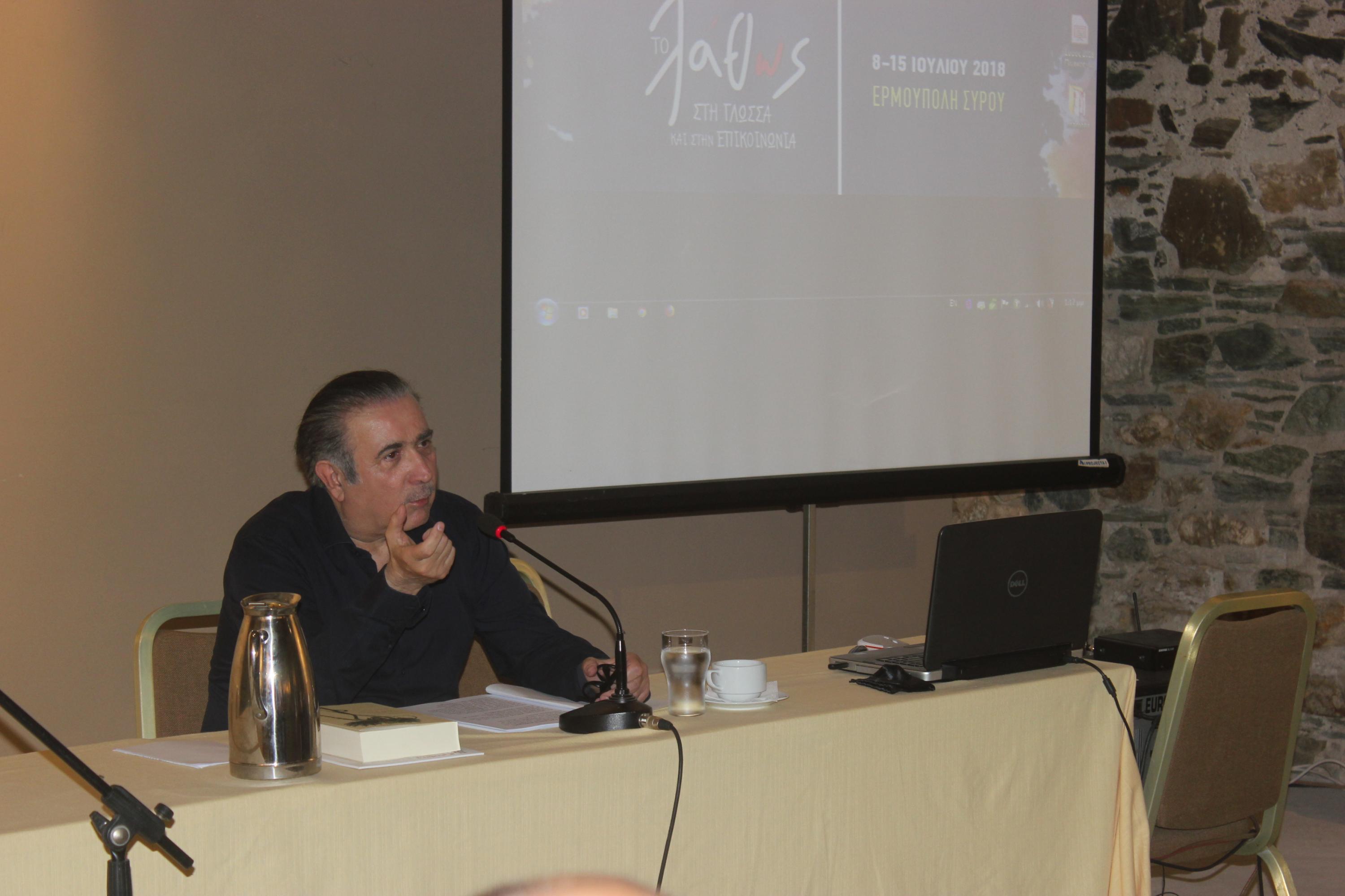 Αμέσως μετά τη θερμή υποδοχή που του επεφύλαξαν στην Πινακοθήκη Κυκλάδων διοργανωτές, συμμετέχοντες ακαδημαϊκοί και φοιτητές, ο δημοφιλής ηθοποιός και σατιρικός συγγραφέας ανέλυσε το βάθος του προβλήματος, τη χρησιμότητα του ψεύδους για την ανάδειξη της μετριότητας και την επιβολή της ανηθικότητας στο παγκόσμιο σύστημα και επίσης, πώς μια κοινωνία ανέχεται σήμερα να υπάρχει ένας πληθυσμός ανθρώπων, όσος των Ηνωμένων Πολιτειών, οι οποίοι να διαθέτουν ψεύτικο προφίλ.