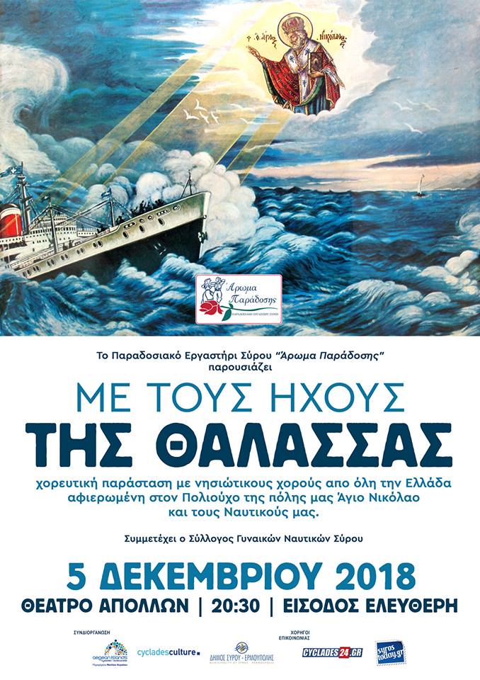 Tο Παραδοσιακό Εργαστήρι Σύρου Άρωμα Παράδοσης παρουσιάζει απόψε μία χορευτική παράσταση με νησιώτικους χορούς από όλη την Ελλάδα αφιερωμένη στον Πολιούχο της πόλης μας, Άγιο Νικόλαο και στους Ναυτικούς μας.