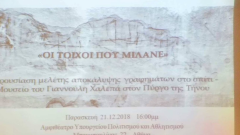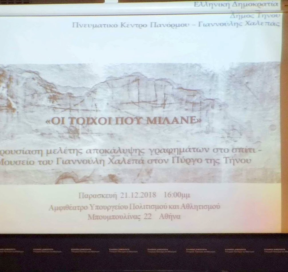 Παρουσίας της Γενικής Γραμματέως του Υπουργείου Πολιτισμού Μαρίας Βλαζάκη, αρχαιολόγου με ειδίκευση στο Μινωϊκό Πολιτισμό και σύσσωμης της επιστημονικής, παιδευτικής και καλλιτεχνικής κοινότητας της Τήνου, παρουσιάστηκε στην Αθήνα η μελέτη «Αποκάλυψης των γραφημάτων στο σπίτι-Μουσείο του Γιαννούλη Χαλεπά στον Πύργο της Τήνου».