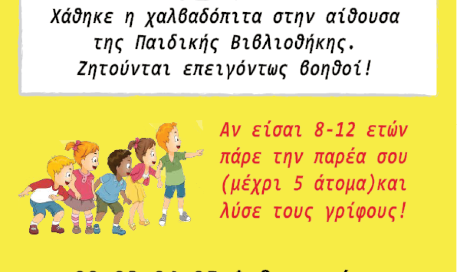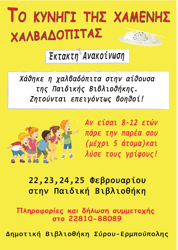 Μετά το «κρυμμένο στολίδι» οι μικροί φίλοι της Δημοτικής Βιβλιοθήκης Σύρου – Ερμούπολης είναι πανέτοιμοι να κυνηγήσουν και να βρουν τη χαμένη χαλβαδόπιτα.