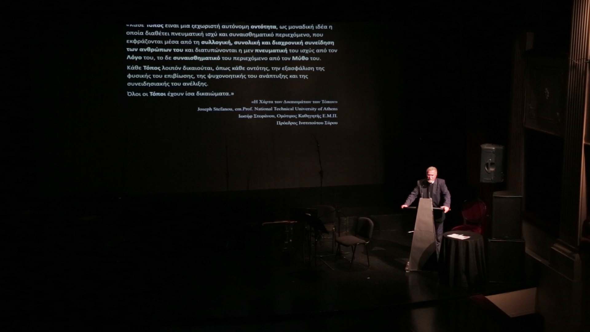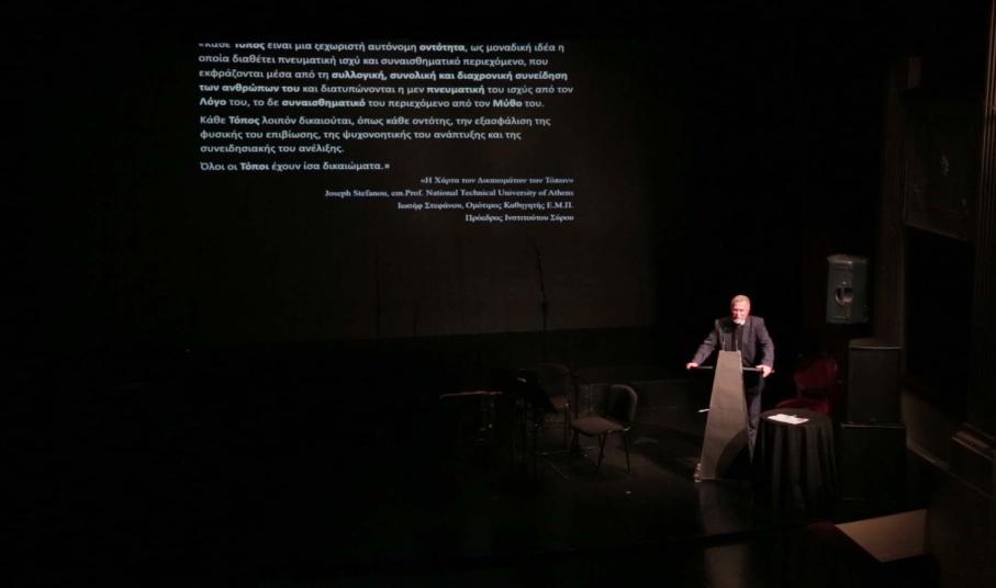 Χαιρετισμό απηύθυνε με τη σειρά του ο πρόεδρος του Ινστιτούτου Σύρου, ομότιμος καθηγητής Ιωσήφ Στεφάνου, ο οποίος υπογράμμισε την αξία της συναισθηματικής νοημοσύνης για την ανάπτυξη της πολιτιστικής σκέψης και την ανάδειξη του πολιτισμού ενός τόπου. Ο ίδιος δεν παρέλειψε να ευχαριστήσει θερμά τον Παύλο Χατζηγρηγορίου, ένα από τα ιδρυτικά και διευθύνοντα μέλη του Ινστιτούτου για την αξιοθαύμαστη προσπάθεια που καταβάλλει.