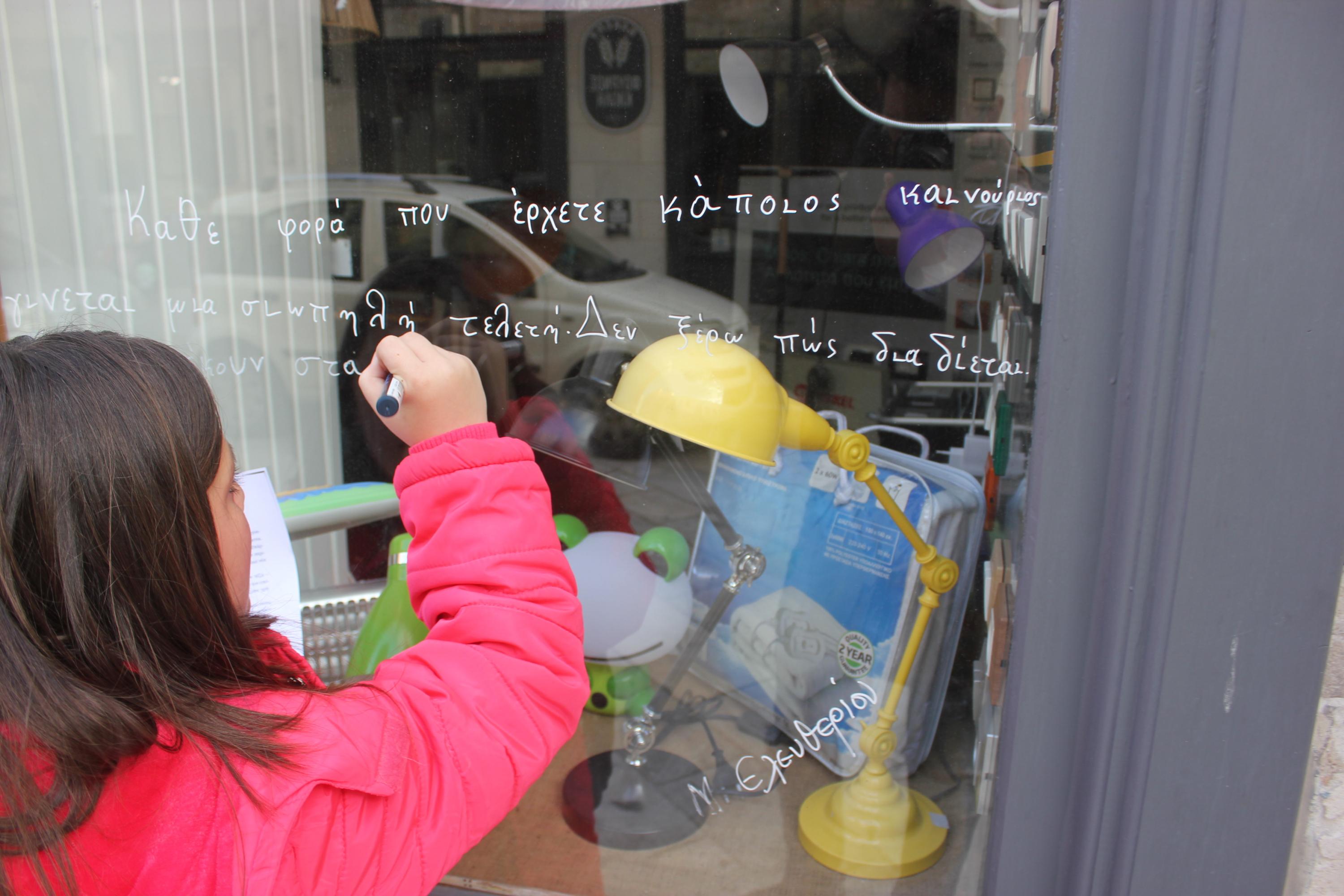 Παρά το τσουχτερό κρύο, περισσότερα από δέκα παιδιά ξεχύθηκαν μαζί με τους υπεύθυνους στους δρόμους της Ερμούπολης, διαβάζοντας και γράφοντας στίχους του Μάνου Ελευθερίου, που τραβούσαν την προσοχή πεζών, αλλά και οδηγών.