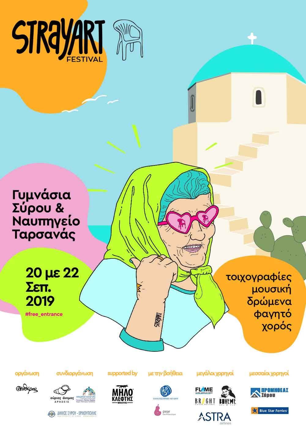 Μετά από δύο επιτυχημένες διοργανώσεις που άφησαν ανεξίτηλα τη σφραγίδα τους και συνέβαλαν στην ανάπτυξη ενός δημόσιου διάλογου μεταξύ της Συριανής κοινωνίας και της τέχνης του δρόμου, το Stray Art Festival ανανεώνει το ραντεβού του με τους φίλους του και έρχεται για τρίτη χρονιά να κλείσει με ένα μαγικό τριήμερο την αυλαία του καλοκαιριού.