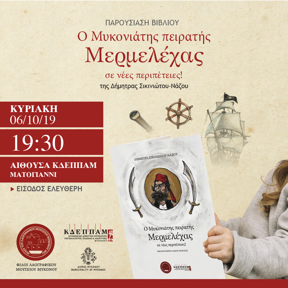H Kοινωφελής Δημοτική Επιχείρηση Περιβάλλοντος Παιδείας και Ανάπτυξης Μυκόνου και το Διοικητικό Συμβούλιο του Σωματείου "Φίλοι του Λαογραφικού Μουσείου Μυκόνου” σας προσκαλούν στην παρουσίαση του νέου παραμυθιού της Δήμητρας Σικινιώτου- Νάζου "Ο Μυκονιάτης πειρατής Μερμελέχας σε νέες περιπέτειες".
