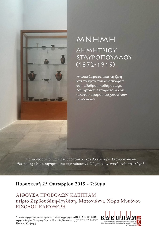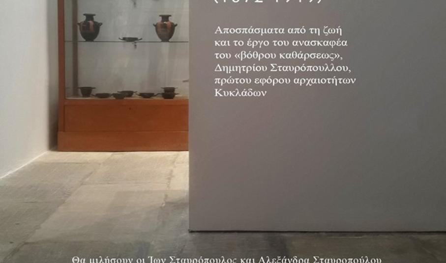 Εκατό χρόνια από το θάνατό του πρώτου Εφόρου Αρχαιοτήτων Κυκλάδων του ελληνικού κράτους, τα δισέγγονά του, ο αρχιτέκτονας Ίων Σταυρόπουλος και η σκηνοθέτης-κοινωνιολόγος Αλεξάνδρα Σταυροπούλου θα μιλήσουν και θα προβάλουν σχετικό οπτικό υλικό.