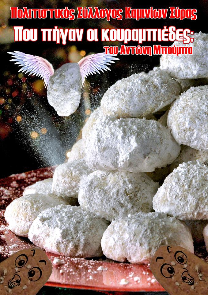 «Κουραμπιέδες» θα κεράσει σε μικρούς και μεγάλους ο Κοινωνικός, Πολιτιστικός & Μορφωτικός Σύλλογος Καμινίων Σύρας. Μετά την αγάπη που δέχτηκε πέρυσι σε Καμίνια και Γαλησσά, η οικογενειακή κωμωδία του Αντώνη Μπούμπα «Πού πήγαν οι κουραμπιέδες;» σε σκηνοθεσία Γιώργου Σιγάλα θα παρουσιαστεί στο Θέατρο Απόλλων, στις 18 και 19 Δεκεμβρίου 2019.
