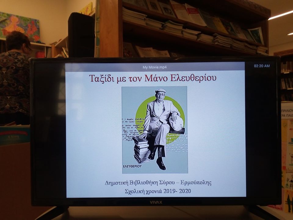 Κατά τη διάρκεια της δράσης, παρουσιάστηκε οπτικοακουστικό υλικό, το οποίο επιμελήθηκε η Σοφία Δεσύπρη. Οι μαθητές ενημερώθηκαν για τη λαμπρή διαδρομή του Μάνου Ελευθερίου στα πεδία της ποίησης, της λογοτεχνίας και της στιχουργικής, την ενασχόλησή του με τη συγγραφή σπουδαίων μελετών όπως «Το Θέατρο στην Ερμούπολη», αλλά και για τα ιδιαίτερα αισθήματα που έτρεφε τόσο για την πατρίδα του όσο και για δομές και φορείς που φρόντιζε μέχρι τέλους, όπως η Βιβλιοθήκη της Σύρου.