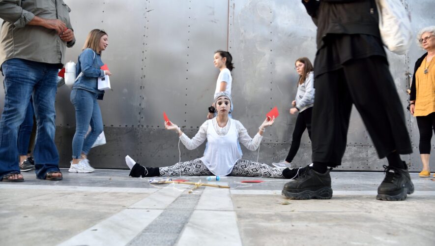Η παρέμβασή μας ήταν εμπνευσμένη από τη μορφή του Λευκού Κλόουν, του καταγόμενου από τον Πιερότο της Commedia dell’arte, που αγαπάει την Κολομπίνα, η οποία όμως τον αφήνει για τον Αρλεκίνο. Ο δικός μας Λευκός Κλόουν είναι θλιμμένος, όχι όμως από έρωτα, αλλά από τη βαθιά απογοήτευση και για το χαμένο του όνειρο, γιατί ζει σε μια πόλη που υπάρχουν φασίστες. Αυτό είναι το πικρό μας μήνυμα και βγήκαμε στον δρόμο για να κάνουμε τους ανθρώπους να σταματήσουν, να χαμογελάσουν, να δουν και να σκεφτούν.