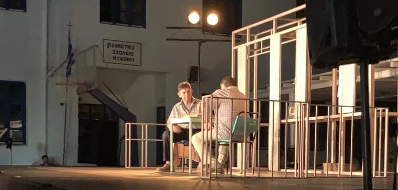 Η επιτυχημένη παράσταση με πρωταγωνιστές τον Ιεροκλή Μιχαηλίδη και τον Γεράσιμο Σκιαδαρέση πραγματοποιήθηκε το περασμένο Σάββατο στο χώρο του 1ου Δημοτικού Σχολείου, σηματοδοτώντας την έναρξη του 3ου Mykonos Art Festival με την καλλιτεχνική διεύθυνση του Θέμη Ροδαμίτη.