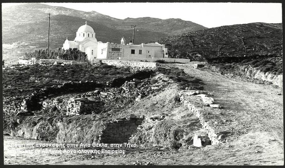 Στο επίκεντρο βρίσκονται τα ευρήματα του σπάνιου για ολόκληρο το Αιγαίο μυκηναϊκού θολωτού τάφου στην Αγία Θέκλα, στη βόρεια Τήνο. Το μικρών διαστάσεων μνημείο, το οποίο υπήρξε και η αφορμή για τη δημιουργία της έκθεσης, αποκαλύφθηκε κατά τις εργασίες διάνοιξης δρόμου και τα υπολείμματά του ερευνήθηκαν από τον αείμνηστο τηνιακό αρχαιολόγο Γεώργιο Δεσπίνη, το 1979. Πρόκειται για έναν από τους μόλις τρεις γνωστούς θολωτούς μυκηναϊκούς τάφους στις Κυκλάδες και αποτελεί τη μοναδική, προς το παρόν, επιβεβαιωμένη μυκηναϊκή θέση στο νησί. Τόπος ταφής ενός γένους «αριστοκρατών», ο τάφος της Αγίας Θέκλας (13ος-12ος αι. π.Χ.) είχε χρησιμοποιηθεί για πολλαπλές ταφές. Τα ευρήματά του (αγγεία, κοσμήματα, χάλκινα αντικείμενα) αποτελούν πολύτιμη πηγή πληροφοριών για τις ταφικές πρακτικές, την κοινωνική οργάνωση και την τέχνη στις Κυκλάδες των τελευταίων αιώνων της 2ης χιλιετίας π.Χ.