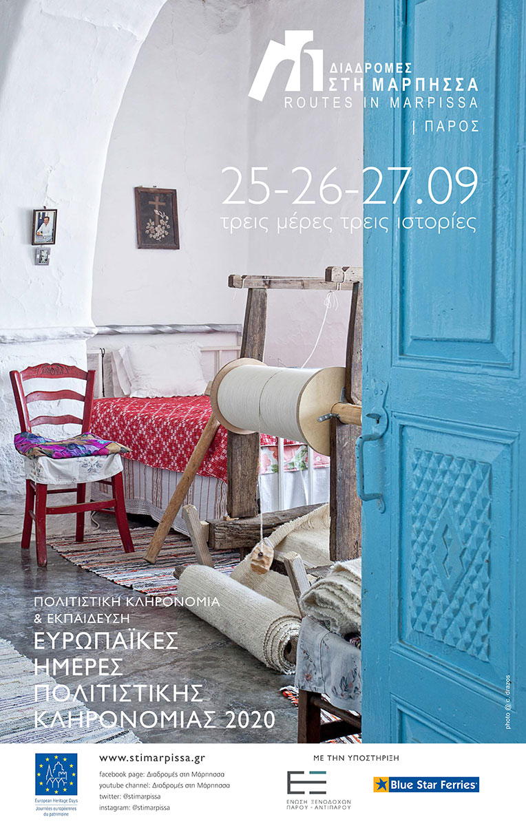 Το σωματείο «Διαδρομές στη Μάρπησσα» συμμετέχει στον ψηφιακό εορτασμό των Ευρωπαϊκών Ημερών Πολιτιστικής Κληρονομιάς (ΕΗΠΚ) 2020 – “Πολιτιστική Κληρονομιά και Εκπαίδευση”, στις 25-27 Σεπτεμβρίου 2020 με τη δημιουργία τριών βίντεο μέσα από τα οποία το κοινό θα ξεναγηθεί ψηφιακά σε τρία ιδιαίτερα κτίσματα της Μάρπησσας της Πάρου.