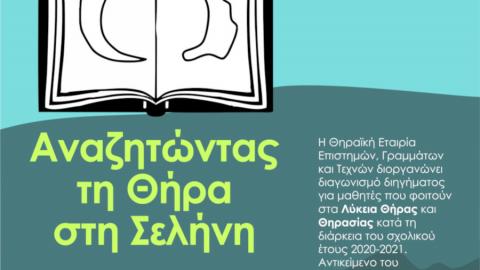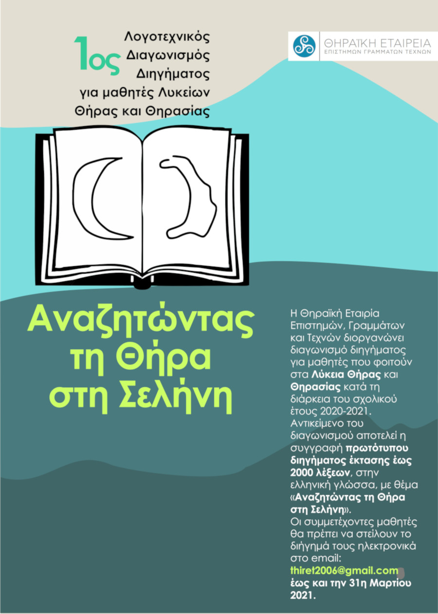 Η Θηραϊκή Εταιρεία Επιστημών, Γραμμάτων και Τεχνών διοργανώνει διαγωνισμό διηγήματος για μαθητές που φοιτούν στα Λύκεια Θήρας και Θηρασίας κατά τη διάρκεια του σχολικού έτους 2020-2021.