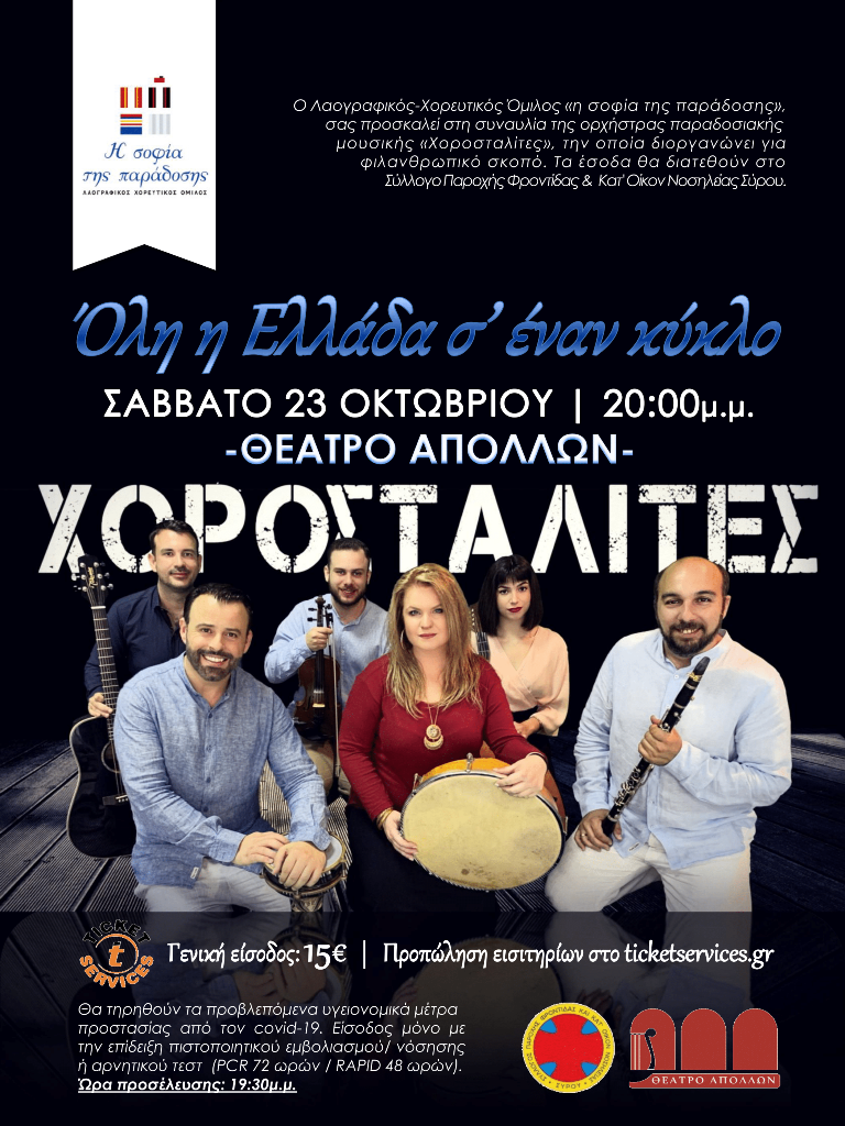 Ο Λαογραφικός Χορευτικός Όμιλος «η σοφία της παράδοσης» παρουσιάζει το Σάββατο 23 Οκτωβρίου 2021 στο Θέατρο Απόλλων την μουσική παράσταση «Όλη η Ελλάδα σ’ έναν κύκλο» της ορχήστρας παραδοσιακής μουσικής «Χοροσταλίτες».