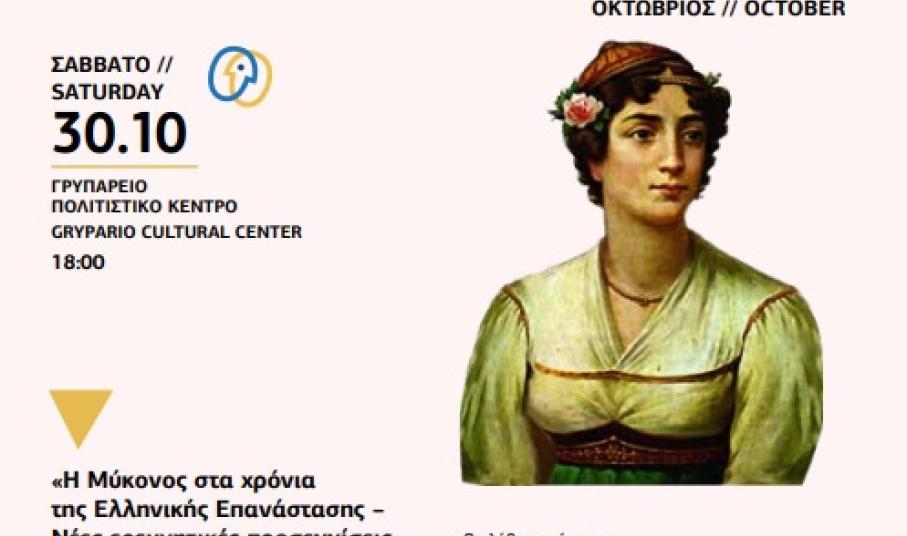 Στα πλαίσια του Mykonos Art Festival και με την ευκαιρία της επετείου των 200 χρόνων από την Ελληνική Επανάσταση του 1821, ο ΠΑΚΟ " Γ. ΑΞΙΩΤΗΣ" δθιοργανώνει διημεριδα με ομιλίες ιστορικού περιεχομένου στο Γρυπάρειο Πολιτιστικό Κέντρο στις 18.00, 30 & 31 Οκτωβρίου 2021