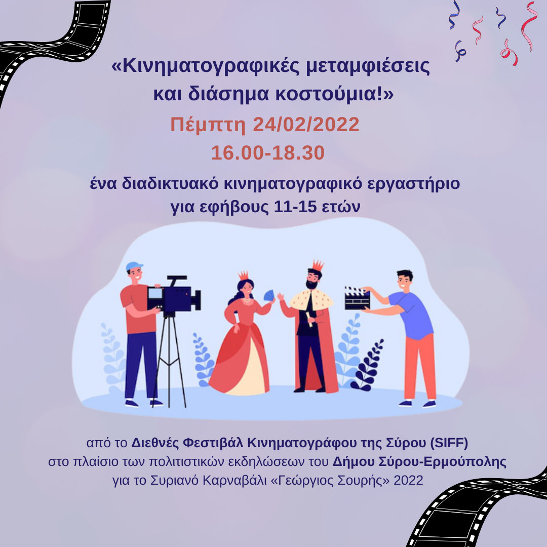 Μετά την «Μέρα γιορτής» του περσινού καρναβαλιού, το Διεθνές Φεστιβάλ Κινηματογράφου της Σύρου έχει την χαρά να συνεργάζεται ξανά με τον Δήμο Ερμούπολης-Σύρου και προσκαλεί τους νεαρούς του φίλους να συμμετέχουν στο εργαστήριο «Κινηματογραφικές μεταμφιέσεις και διάσημα κοστούμια!».