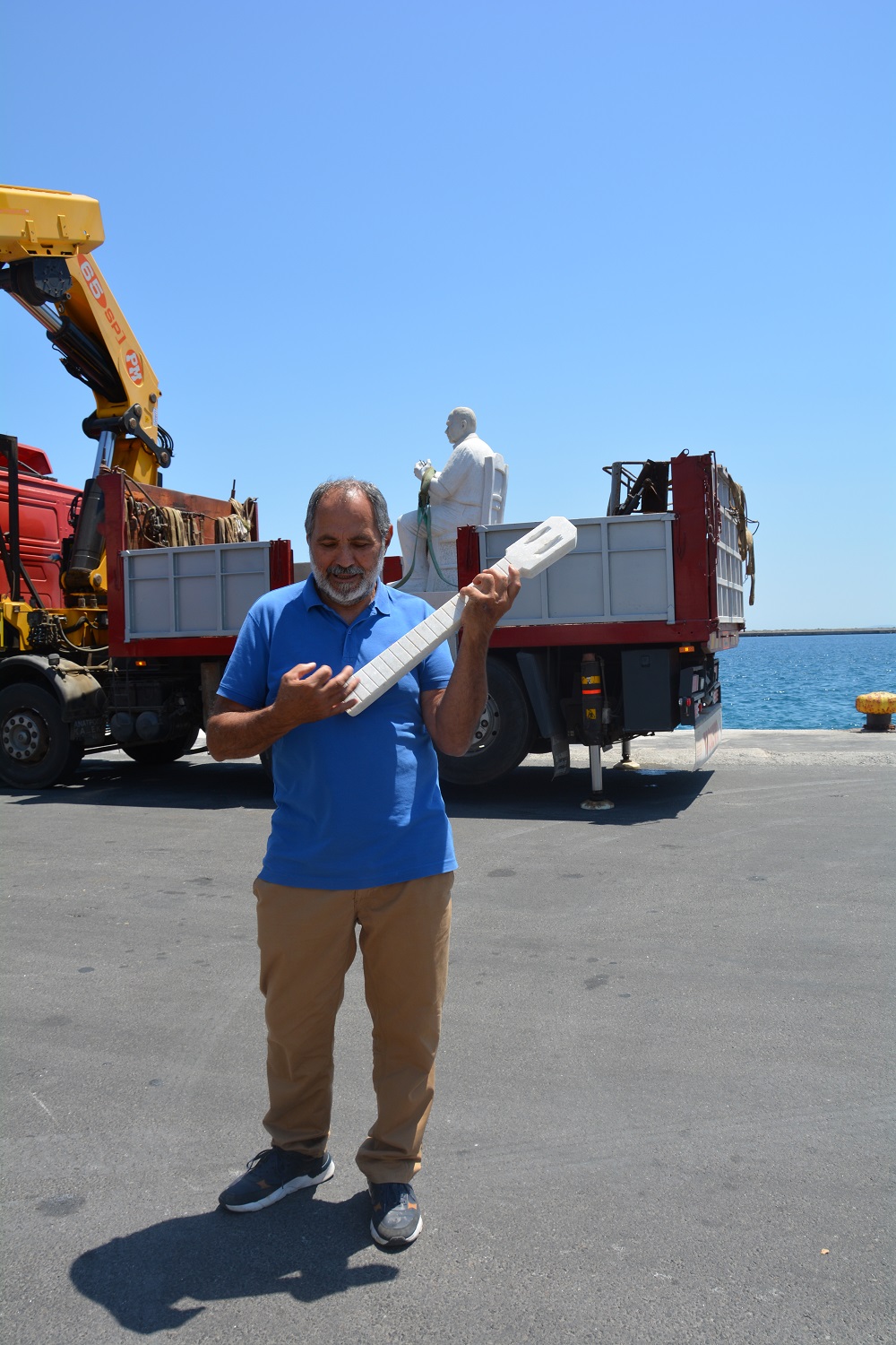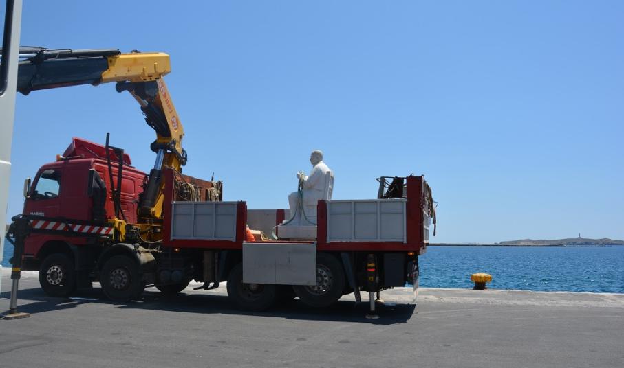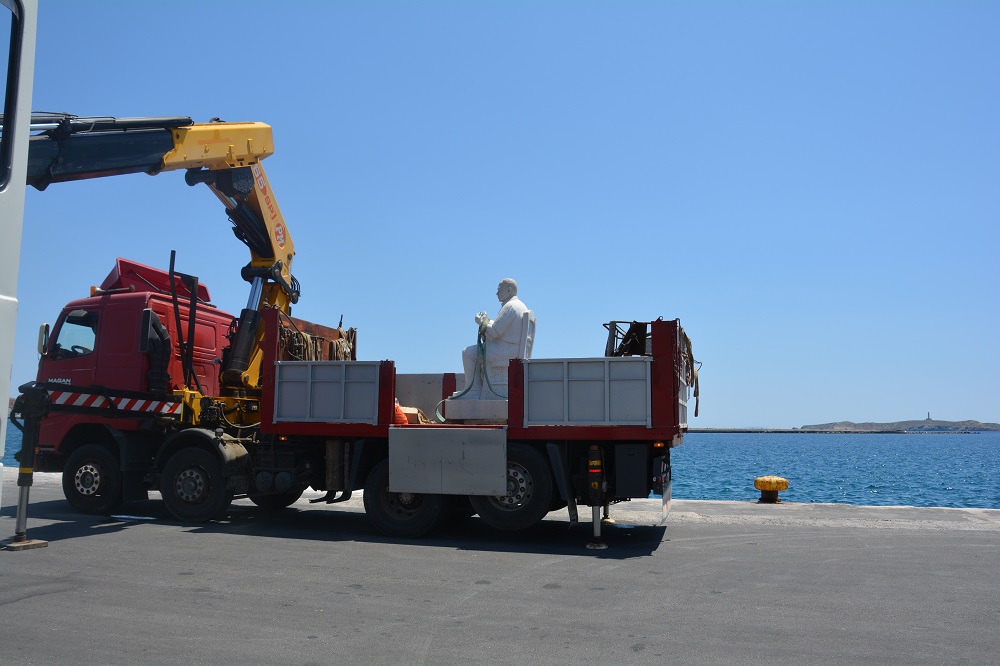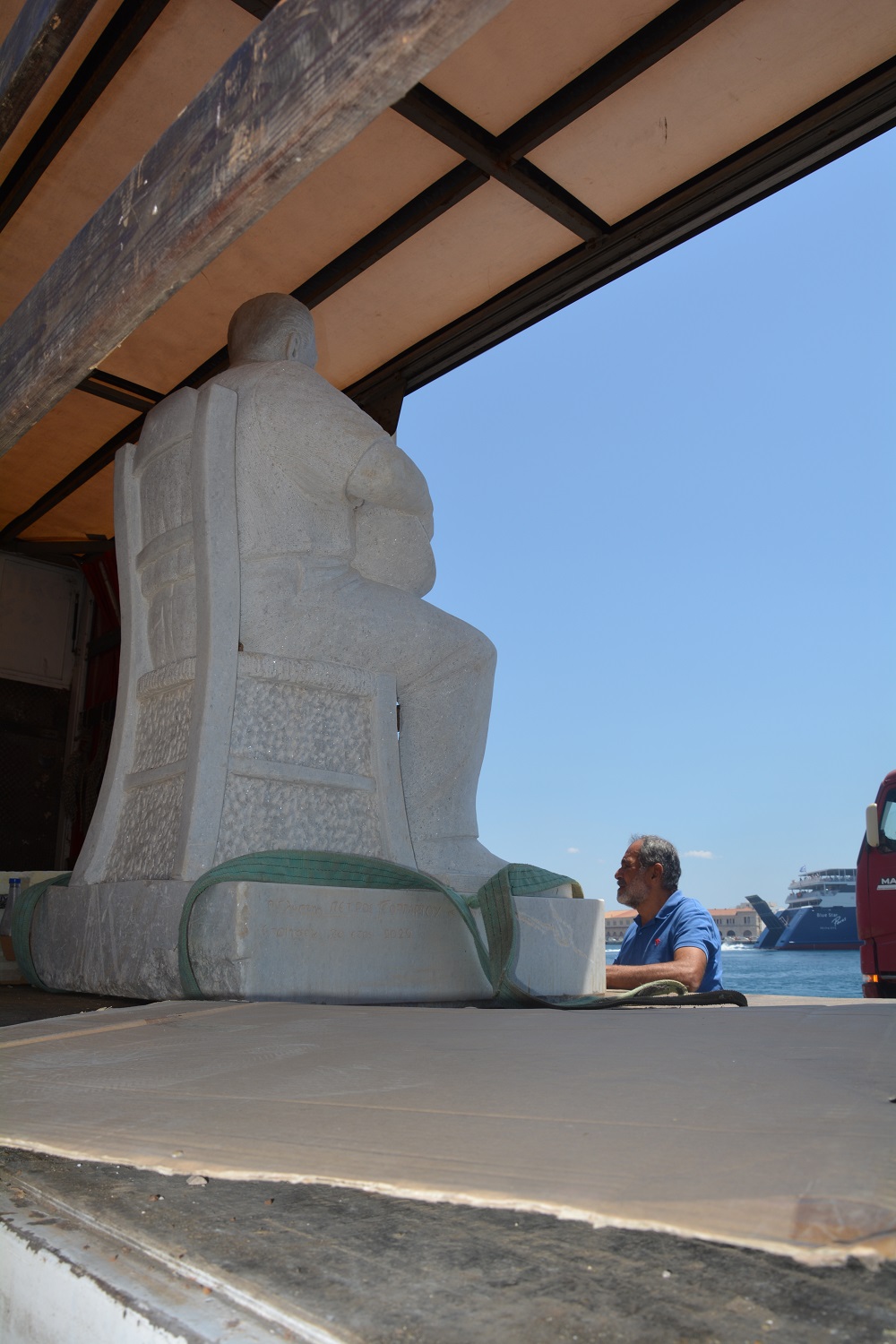 Το άγαλμα συνόδευε ο δημιουργός του, ο γλύπτης Πέτρος Γεωργαρίου, ο οποίος επέβλεπε όλη τη διαδικασία με συγκίνηση αλλά και πολλή αγωνία.