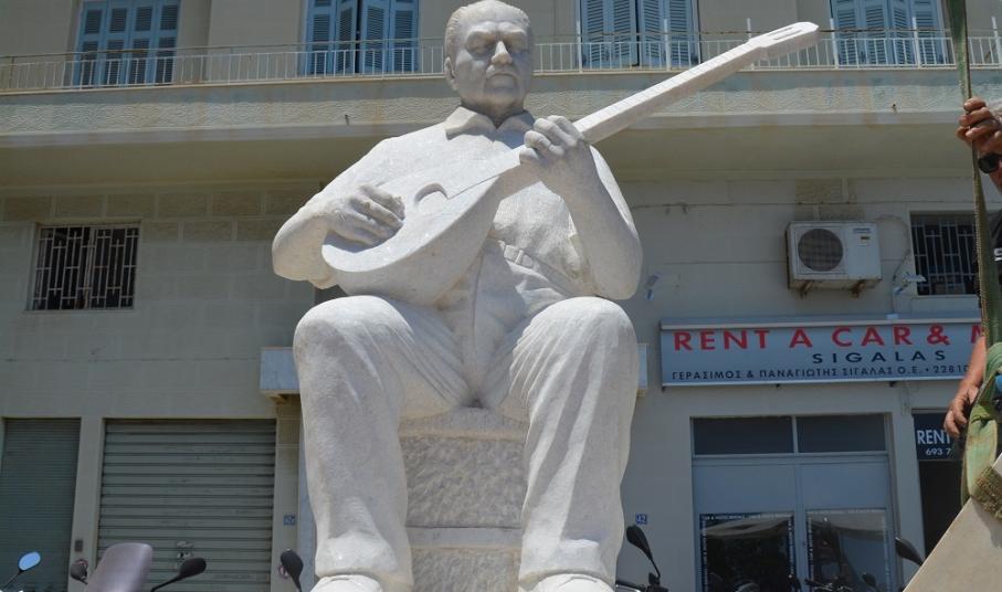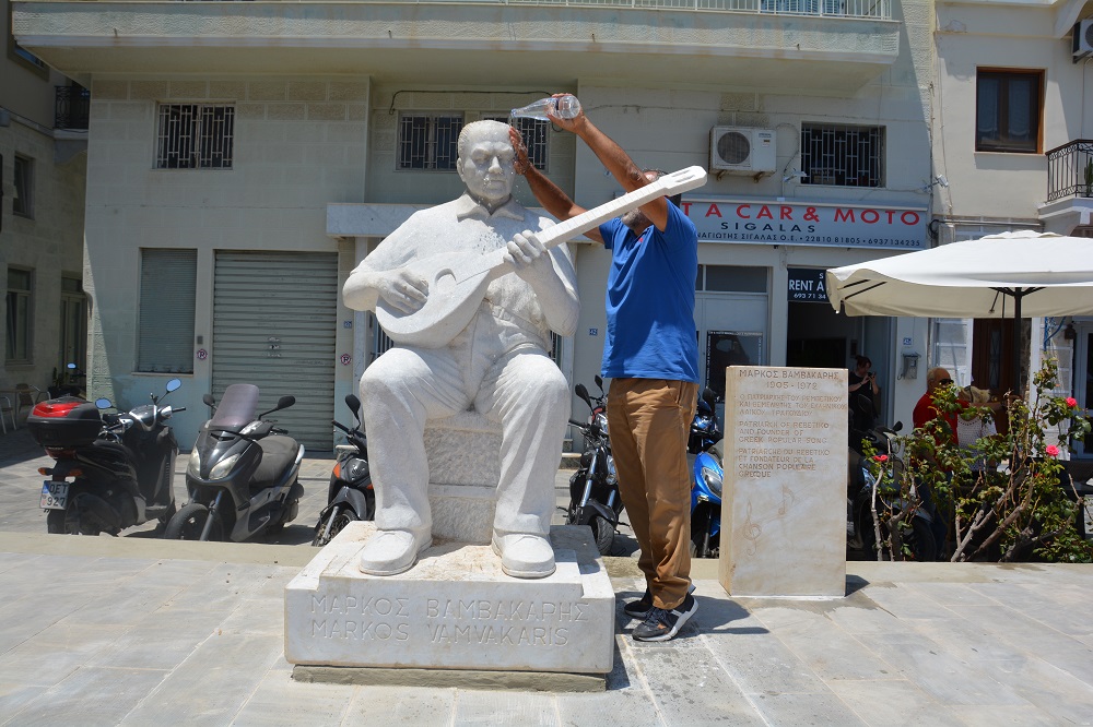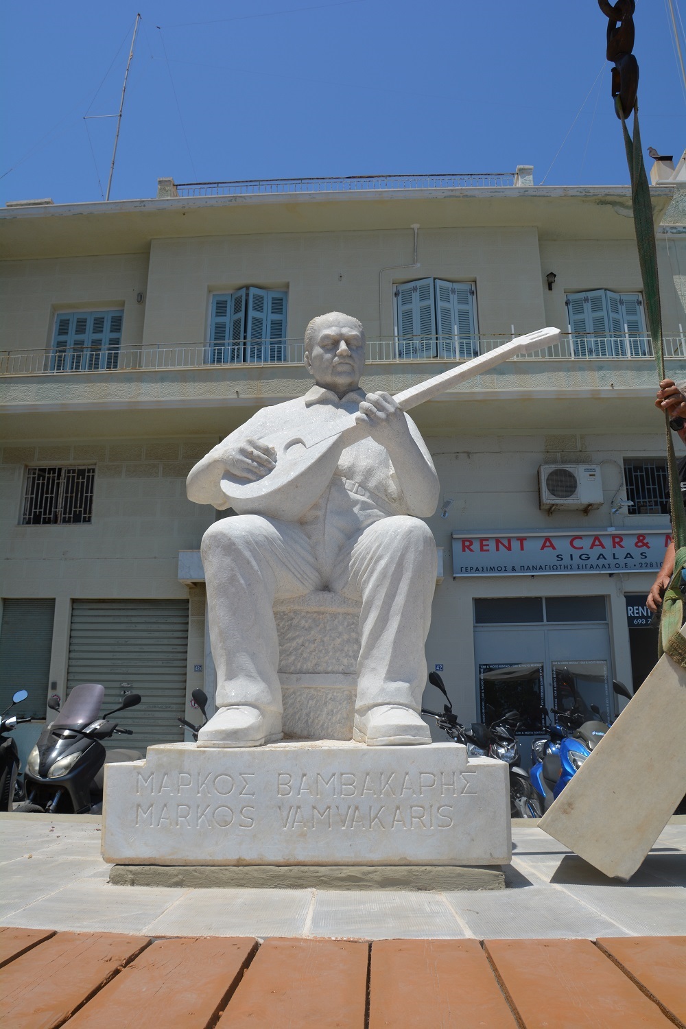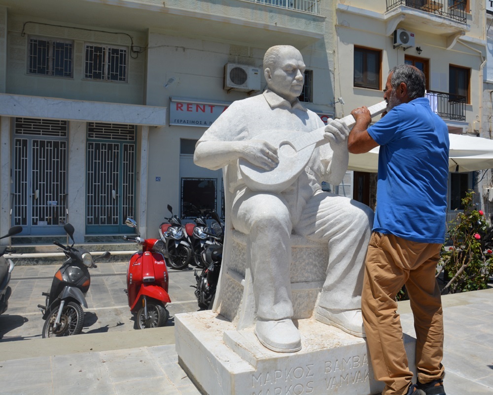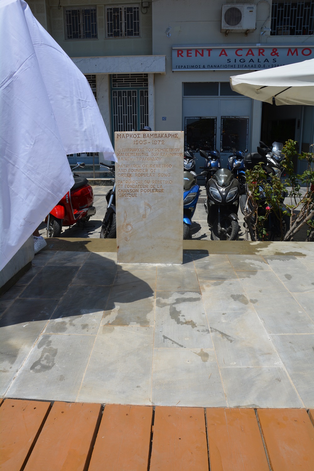 Το 2 μέτρων ύψους και 2,5 τόνων βάρους άγαλμα, τοποθετήθηκε στη βάση του, μετά από πολύωρη και προσεκτική εργασία και από τα πρώτα λεπτά συγκέντρωσε τα βλέμματα των περαστικών που έσπευσαν να το φωτογραφήσουν πριν αυτό καλυφθεί. Το άγαλμα αποτυπώνει τον Μάρκο Βαμβακάρη καθιστό να παίζει το μπουζούκι του, όπως ακριβώς είναι γνωστή η εικόνα του, που οι περισσότεροι έχουν στο μυαλό τους. Η εντυπωσιακή ομοιότητά του με τον σπουδαίο ρεμπέτη εξηγείται μέσα από τα λόγια του γλύπτη: “Όταν φιλοτεχνώ ένα άγαλμα γίνομαι ο ήρωας, το πρόσωπο που φιλοτεχνώ. Αφομοιώνομαι. Γίνομαι Βαμβακάρης. Ψάχνω να μάθω γιατί έγραψε τη Φραγκοσυριανή , γιατί τραγούδαγε ρεμπέτικα, πώς ήταν αυτός ο άνθρωπος στην καθημερινή του ζωή, ποια ήταν η συμπεριφορά του. Ξέρω μέχρι και που πετούσε το αποτσίγαρό του. Τα πάντα. Το άγαλμα είναι βασικά παιδί μου γιατί βγήκε μέσα από τη ψυχή μου. Ένας ψυχολόγος, όταν τον ρώτησα τη γνώμη του για το άγαλμα, μου απάντησε: “Είναι και φαίνεται” δεν μοιάζει δηλαδή με τον Μάρκο, είναι ο Μάρκος. Σαν ψυχισμός, σαν ύφος, σαν υπόσταση. Δεν με ενδιέφερε να κάνω απλά τη φυσιογνωμία του αλλά να μεταφέρω όλο αυτό που ήταν ο Μάρκος”.