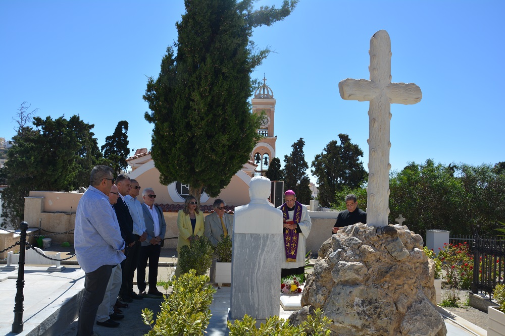 Από νωρίς το πρωί, ο Βασίλης Βαμβακάρης, είχε επισκεφθεί το μνημείο του πατέρα του στο καθολικό κοιμητήριο για την τέλεση τρισάγιου στη μνήμη του, από τον καθολικό επίσκοπο π. Πέτρο Στεφάνου. Στη συνέχεια, επισκέφθηκε τα εκπαιδευτήρια Δελασάλ και το Βαμβακάρειο Γυμνάσιο, του οποίου είναι μέγας δωρητής, και αφού περιηγήθηκε στους χώρους του σχολείου, συνομίλησε σε ευχάριστο κλίμα με παιδιά κι εκπαιδευτικούς.