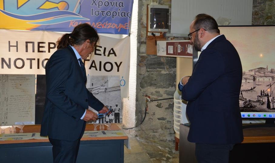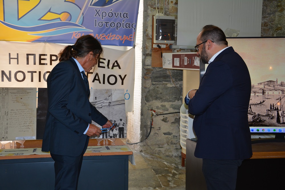 Στη συνέχεια, οι επίσημοι ξεναγήθηκαν στην έκθεση του Ναυτικού Ομίλου Σύρου, ενημερώθηκαν για την ιστορία του Φάρου της Σύρου, ενώ έγινε και μια παρουσίαση των διαδραστικών εκθεμάτων και εφαρμογών που έχουν σχεδιάσει οι φοιτήτριες Αργυρώ Καραχάλιου, Ζωή Μεταξά και Δήμητρα Μακρυκώστα, του Τμήματος Μηχανικών Σχεδίασης Προϊόντων και Συστημάτων του Πανεπιστημίου Αιγαίου και αφορούν στην ναυτική ιστορία του νησιού.
