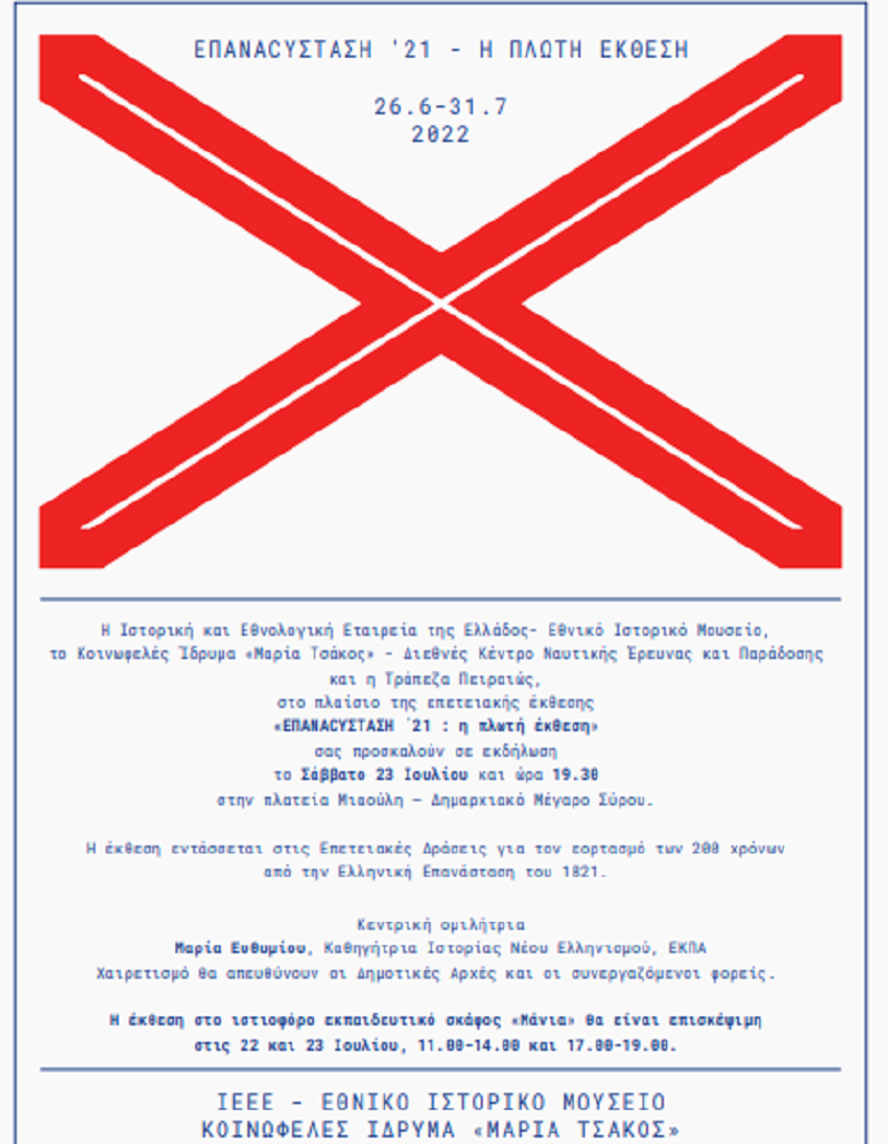 Η Ιστορική και Εθνολογική Εταιρεία της Ελλάδος- Εθνικό Ιστορικό Μουσείο, το Κοινωφελές Ίδρυμα «Μαρία Τσάκος» - Διεθνές Κέντρο Ναυτικής Έρευνας και Παράδοσης και η Τράπεζα Πειραιώς, στο πλαίσιο των εκδηλώσεων που διοργανώθηκαν για να τιμηθεί η επέτειος των 200 χρόνων από την έναρξη της Ελληνικής Επανάστασης, παρουσιάζουν μια πραγματικά πρωτότυπη και άκρως ενδιαφέρουσα έκθεση, η οποία επιθυμεί να μεταφέρει το μήνυμα ότι ο ναυτικός αγώνας ήταν το κρίσιμο εκείνο στοιχείο που επέτρεψε την εδραίωση της ανεξαρτησίας.