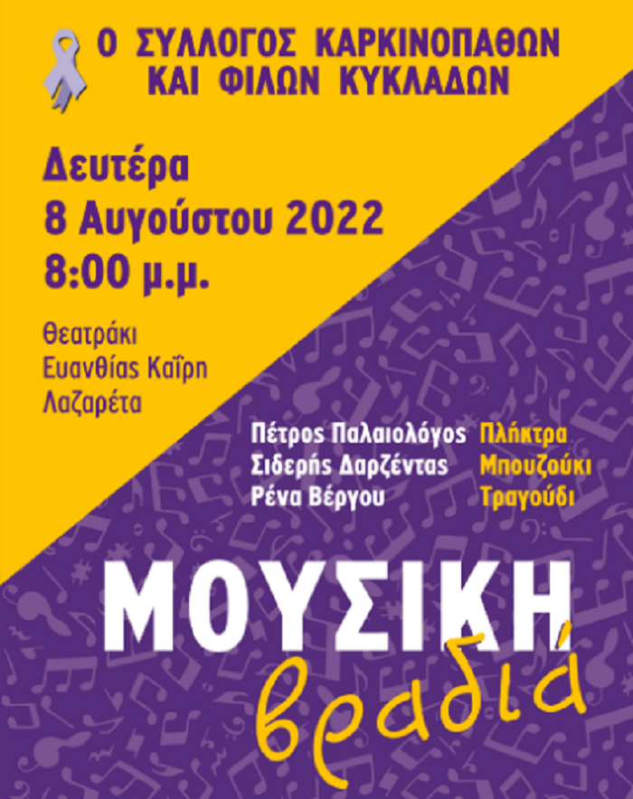 Ο Σύλλογος Καρκινοπαθών και φίλων Κυκλάδων προσκαλεί τα μέλη του για μία όμορφη Αυγουστιάτικη βραδιά, τη Δευτέρα 08 Αυγούστου και ώρα 20:00΄, στον πολύ όμορφο χώρο του Θεάτρου Ευανθίας Καίρη, στα Λαζαρέττα.