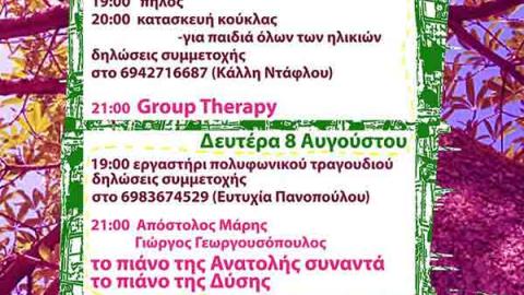 Την Τρίτη 9 Αυγούστου, η μουσική έχει και πάλι τον πρωταγωνιστικό ρόλο με ένα εργαστήρι κρουστών για παιδιά 7 ετών και άνω, από τον Χρήστο Αδαμίδη, ενώ για να μη μείνουν παραπονεμένοι οι γονείς, το εργαστήρι θα επαναληφθεί στις 20.00 για τους ενήλικες. Το τριήμερο εκδηλώσεων θα κλείσει με παραδοσιακά κι έντεχνα ακούσματα από τη Μαρία Πλουμή, τη Γεωργία Λίτσα και τον Δημήτρη Πάντο.