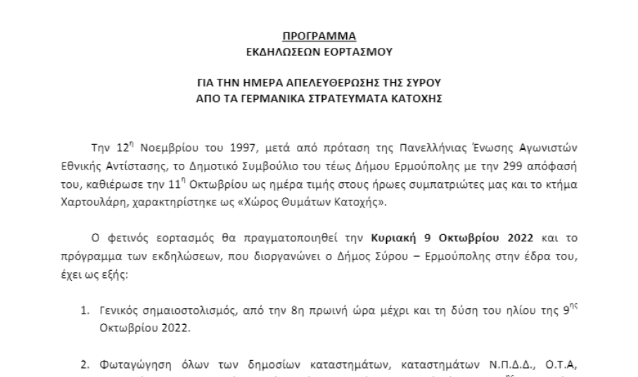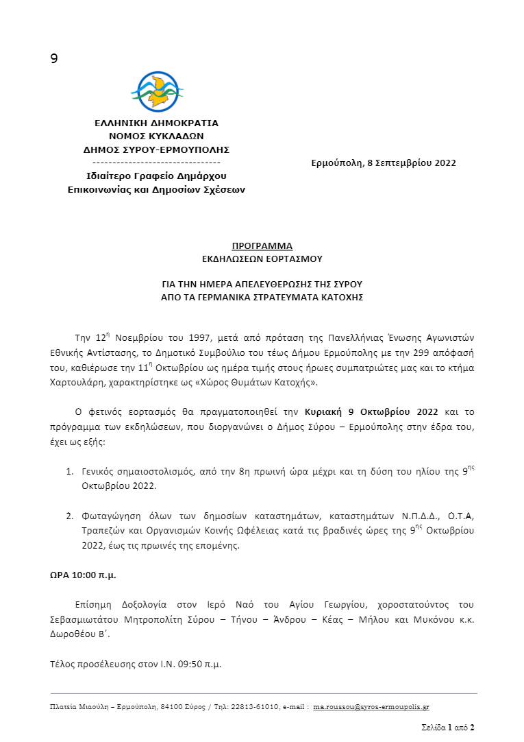 1.Γενικός σημαιοστολισμός από την 8η πρωινή ώρα μέχρι και τη δύση του ηλίου της 9ης Οκτωβρίου 2022.