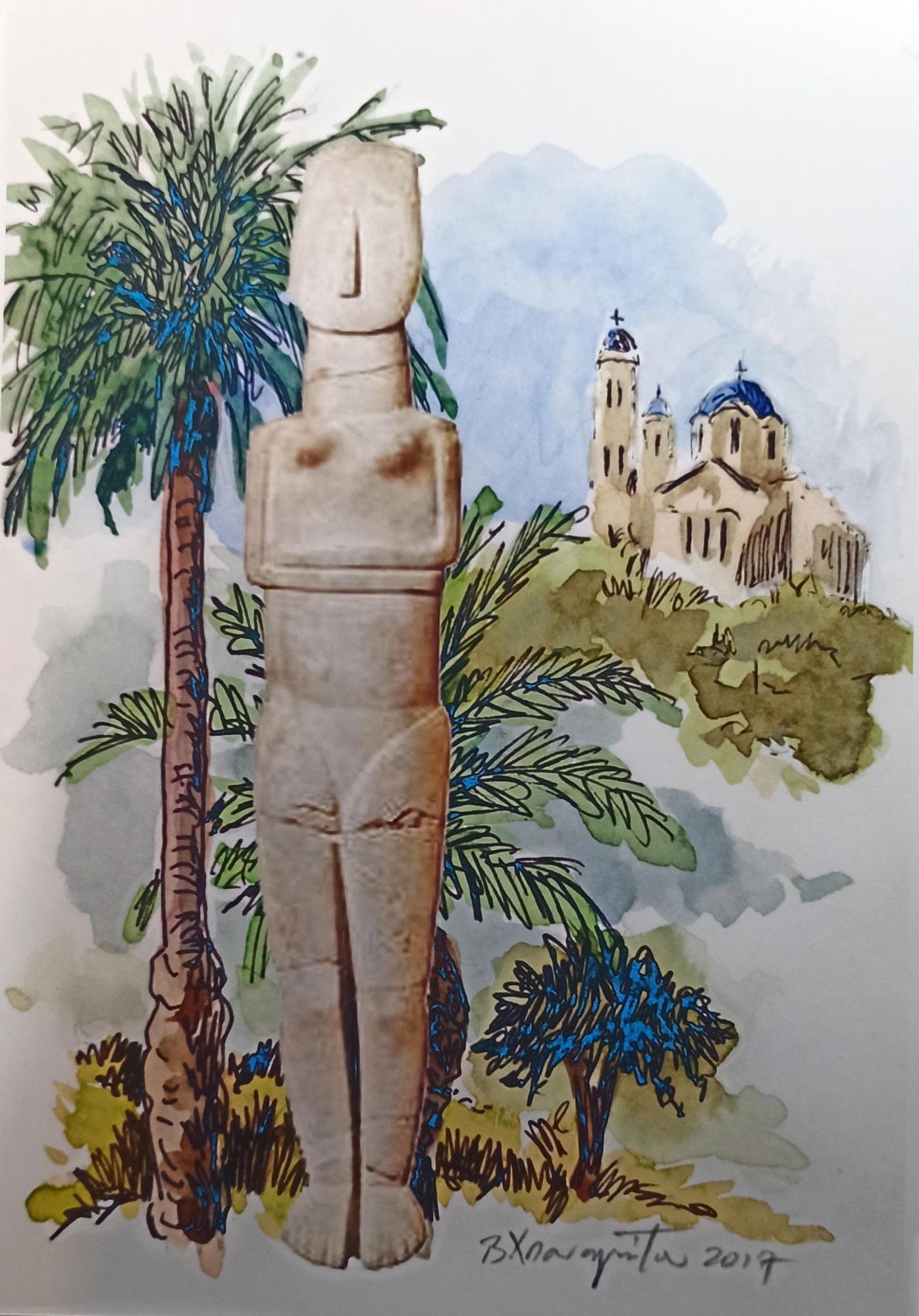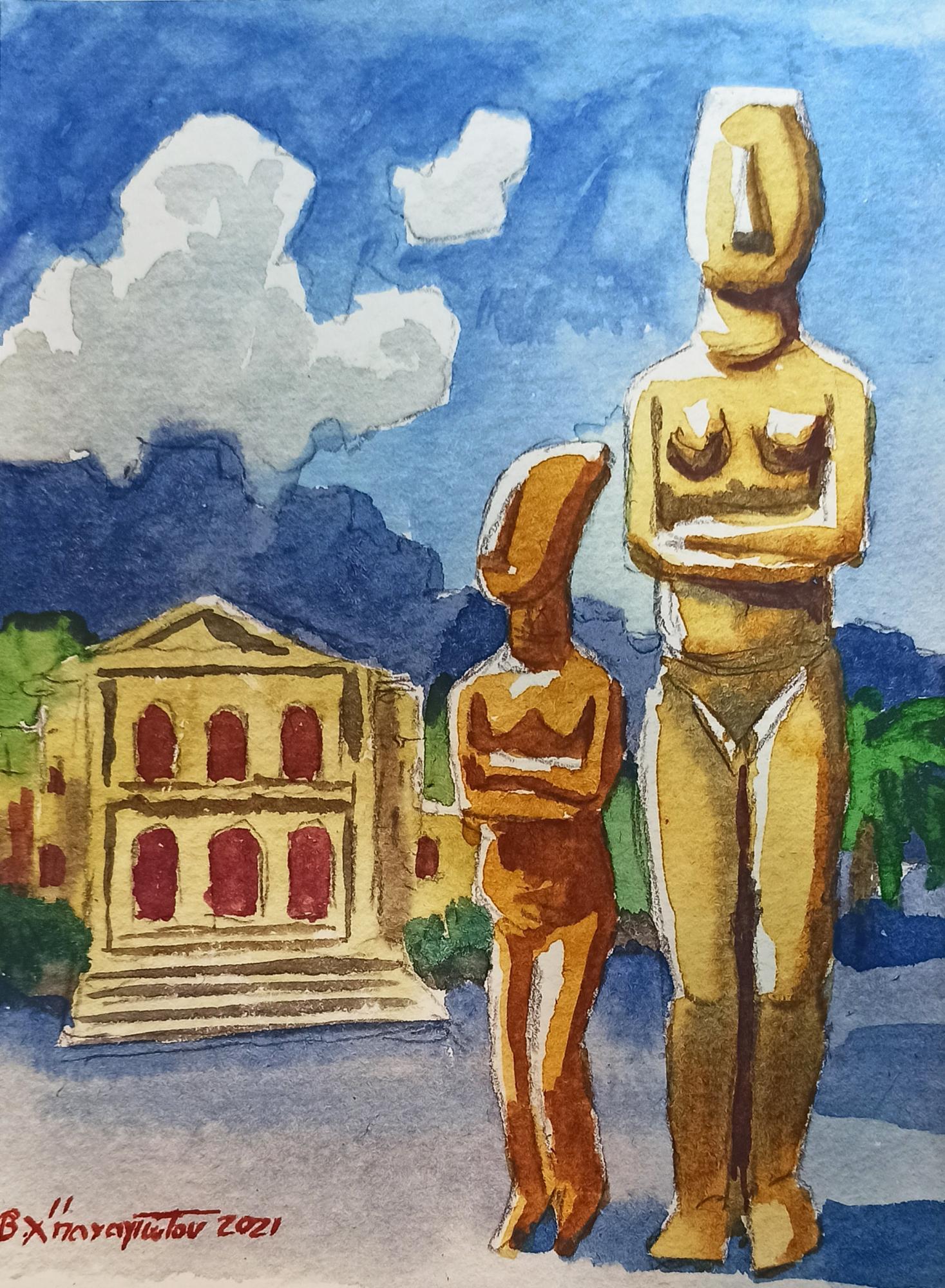 Με αυτόν τον τίτλο τιμά την αρχαία ιστορία των Κυκλάδων ο κ. Βασίλης Χατζηπαναγιώτου, συνταξιούχος εκπαιδευτικός και ερασιτέχνης ζωγράφος. Θα εκθέσει τα έργα ζωγραφικής με θέμα τα Κυκλαδικά ειδώλια στην αίθουσα Ροΐδη του Πνευματικού Κέντρου Ερμούπολης. Η έκθεση θα λειτουργεί Τρίτη, Πέμπτη, Σάββατο και Κυριακή και ώρες 6-9 μετά μεσημβρία. Η αίθουσα Ροΐδη είναι ακριβώς δίπλα στην αίθουσα, που πάρα πολλά χρόνια πριν και έως σήμερα, είναι το “Μουσείο αντιγράφων Κυκλαδικής Τέχνης”, το οποίο δημιουργήθηκε με την προσφορά της Ντόλλης Γουλανδρή, που είχε δημιουργήσει το θαυμάσιο “Μουσείο Κυκλαδικής Τέχνης” στην Αθήνα. Έχουν περάσει περίπου 35 χρόνια από τότε που σ’ αυτό το υπέροχο Μουσείο που δημιουργήθηκε, πέρασαν χιλιάδες παιδιά από τη Σύρο και από άλλες περιοχές της Ελλάδας και γνώριζαν την αρχαία ιστορία του Κυκλαδικού πολιτισμού. Σήμερα βρίσκονται στη Σύρο δύο αξιόλογοι πρώην δάσκαλοι, ο κ. Βασίλης Χατζηπαναγιώτου και η σύζυγός του Λουκία, που ήταν δάσκαλοι στην Καστοριά, στην Αθήνα... και φρόντισαν να επισκεφθούν τη Σύρο, που είχαν ακούσει άριστα σχόλια για το νησί, για τους ανθρώπους του και για το θαυμάσιο κλίμα του. Συνάντησαν δασκάλες και νηπιαγωγούς, ασχολήθηκαν με διάφορα μαθήματα των παιδιών και προσέφεραν και τις δικές τους γνώσεις. Είχαν και έχουν πάντα άριστες προτάσεις και επιθυμία να προσφέρουν ειδικά μαθήματα σε δασκάλες και νηπιαγωγούς για κάτι ιδιαίτερο. Στον κ. Βασίλη και στην κ. Λουκία αρέσει πολύ η Σύρος και ζουν εδώ αρκετό καιρό. Ο κ. Βασίλης, εκτός από δάσκαλος, ιδιαίτερα θαύμασε την αρχαία εποχή των Κυκλάδων και τα θαυμάσια ειδώλια... τα οποία μας τα παρουσιάζει ως άριστος ζωγράφος, και αναφέρει: