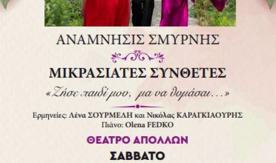 Το Σάββατο 29 Οκτωβρίου στις 21:00 στο Δημοτικό Θέατρο Ερμούπολης «Απόλλων» οι Λένα Σουρμελή, ο Νικόλας Καραγκιαούρης και η Olena Fedko παρουσιάζουν μια μοναδική παράσταση με μουσική συνθετών Μικρασιάτικης καταγωγής.