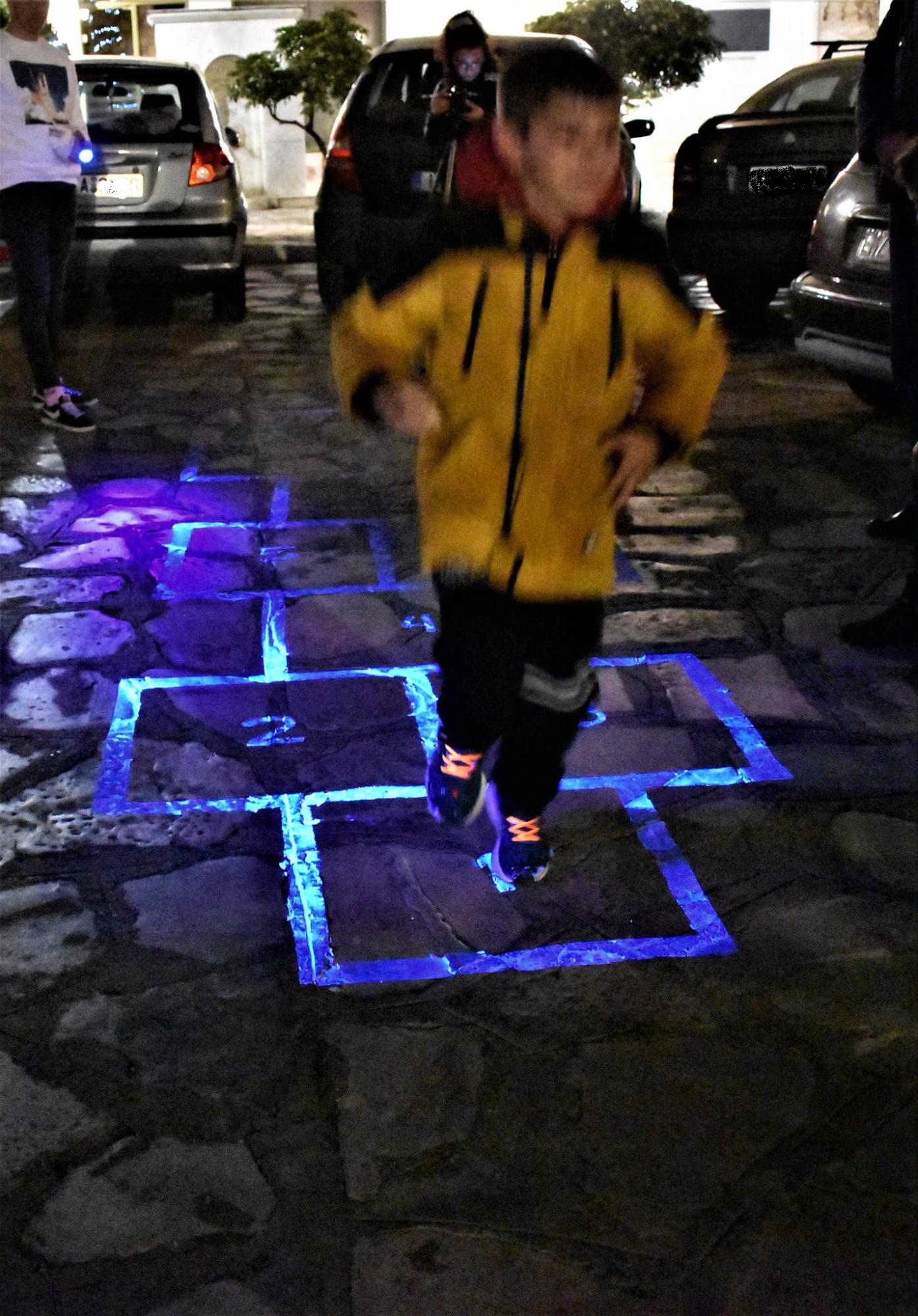 Οι παρεμβάσεις που έγιναν στο δημόσιο χώρο του νησιού ενεργοποιούνται μόνο τη νύχτα με τη βοήθεια ειδικού φωτισμού (φακών black light) που δε θα αλλοιώνουν το κυκλαδίτικο χρώμα και τις προσόψεις των κτηρίων. Σε επιλεγμένα σημεία της διαδρομής έχουν τοποθετηθεί επίσης Qr codes, τα οποία σκανάρωντας τα, ζωντανεύουν δίνοντας την ευκαιρία στον καθένα να ακούσει τους ίδιους τους πρωταγωνιστές να περιγράφουν τις ιστορίες, τους κανόνες και τις περιγραφές από τα παιχνίδια που έπαιζαν ως παιδιά στα στενά της Τήνου.