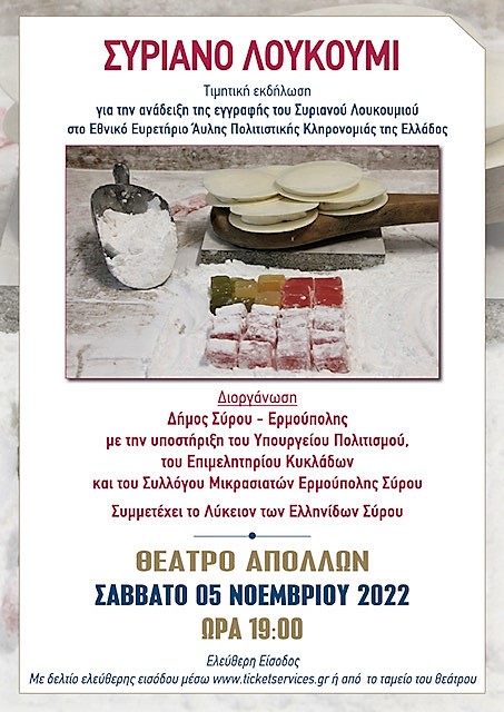 Τιμητική εκδήλωση, το Σάββατο 5 Νοεμβρίου, για την ανάδειξη της εγγραφής του Συριανού Λουκουμιού στο Εθνικό Ευρετήριο Άυλης Πολιτιστικής Κληρονομιάς της Ελλάδος.