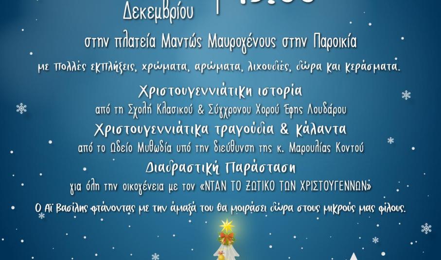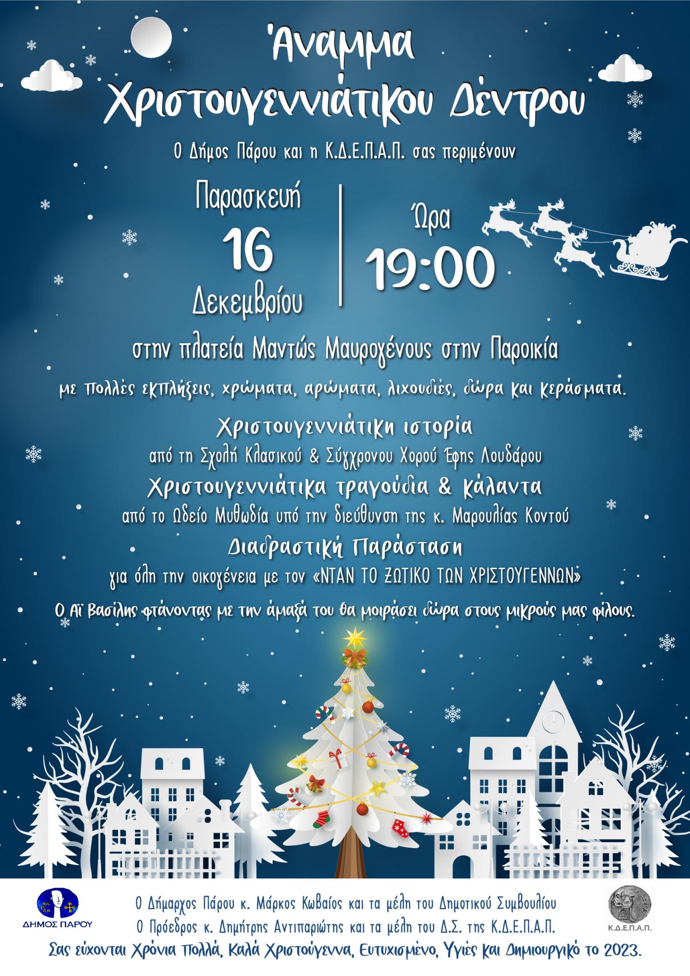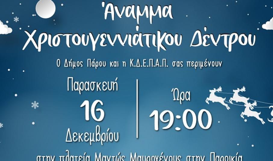 Κυκλοφόρησε η αφίσα για την εκδήλωση που θα πραγματοποιηθεί στην Παροικιά της Πάρου για το άναμμα του Χριστουγεννιάτικου δέντρου την Παρασκευή 16 Δεκεμβρίου στις 19:00 στην πλατεία Μαντώς Μαυρογένους.