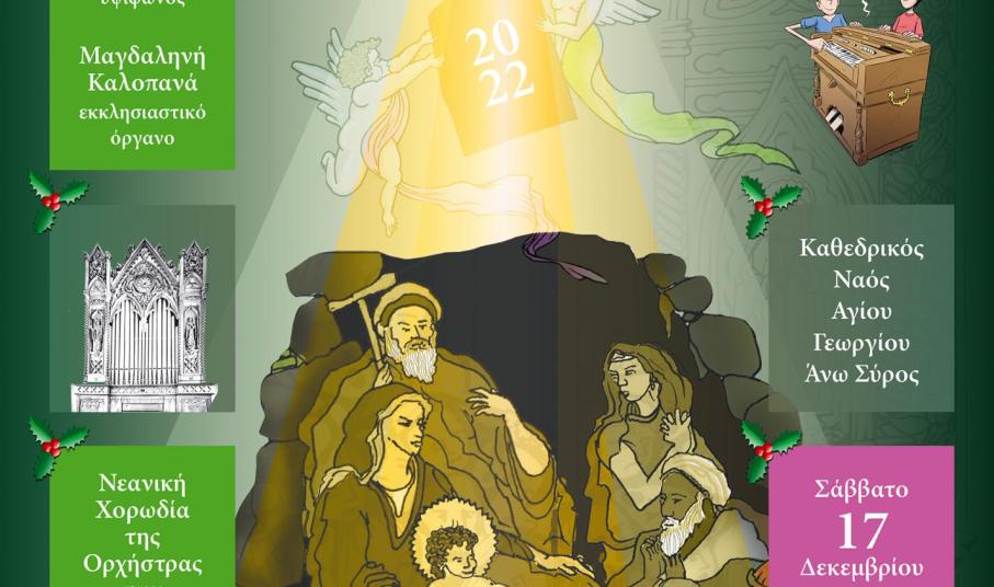 Το Σάββατο 17 Δεκεμβρίου 2022, στις 20.00, στον Καθεδρικό Ναό Αγίου Γεωργίου Άνω Σύρου, θα παρουσιαστεί μια ξεχωριστή συναυλία, με την οποία ολοκληρώνεται ο κύκλος εκδηλώσεων του Διεθνούς Φεστιβάλ Εκκλησιαστικού Οργάνου «ΑΝΩ» για το έτος 2022. Στη συναυλία θα παρουσιαστούν έργα σπουδαίων συνθετών, όπως οι Χέντελ, Μπαχ, Μότσαρτ και Καλομοίρης, άλλα και εκκλησιαστικοί ύμνοι και κάλαντα των Χριστουγέννων και της Πρωτοχρονιάς που θα μεταφέρουν στο κοινό το χαρμόσυνο μήνυμα των ημερών.