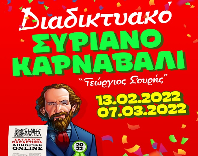 13/2: Ξεκινά το Συριανό Καρναβάλι «Γεώργιος Σουρής» 2022 που πραγματοποιείται για ακόμη μία χρονιά σε διαφορετικό πλαίσιο με συμβολικές δράσεις λόγω των περιοριστικών μέτρων κατά της πανδημίας.