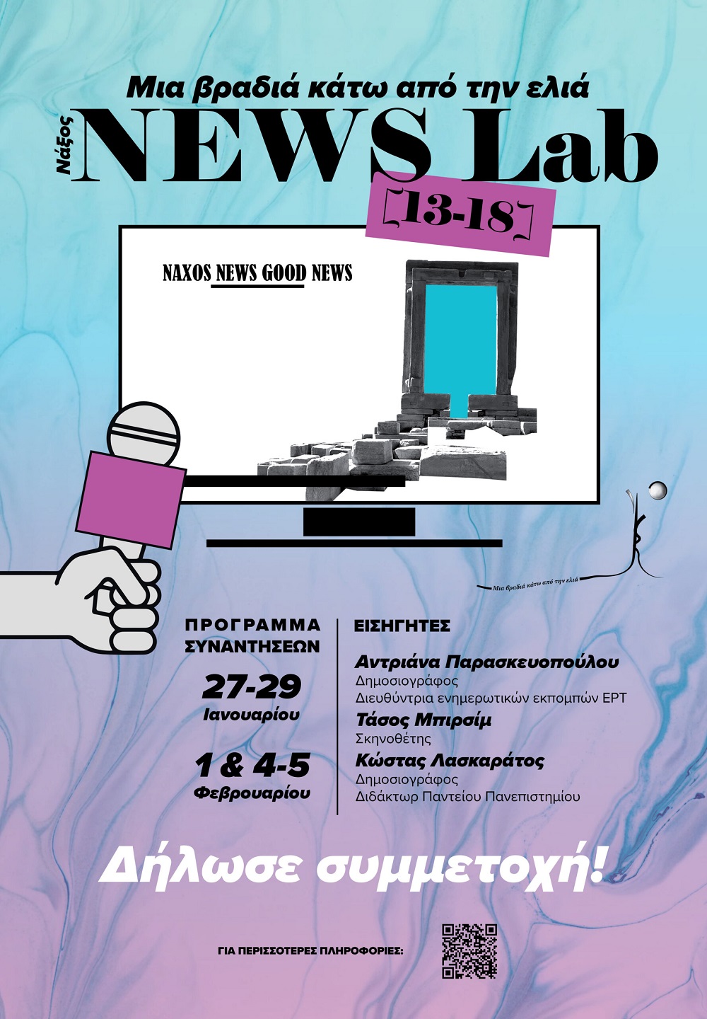 Οι συναντήσεις του «Naxos News Lab» θα πραγματοποιηθούν στις 27-29 Ιανουαρίου και 1, 4 & 5 Φεβρουαρίου στη Νάξο. Η συμμετοχή είναι δωρεάν και απαιτείται προεγγραφή στα τηλέφωνα 6986003069 και 6950777111, καθώς οι θέσεις είναι περιορισμένες.