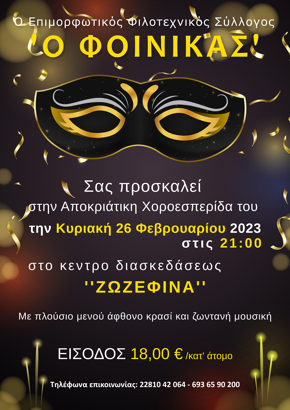 Αποκριάτικη χοροεσπρίδα διοργανώνεται την Κυριακή 26 Φεβρουαρίου από τον Επιμορφωτικό Φιλοτεχνικό Σύλλογο Φοίνικα Σύρου.