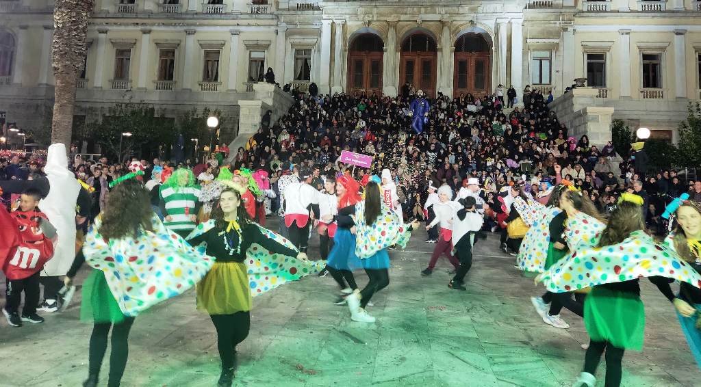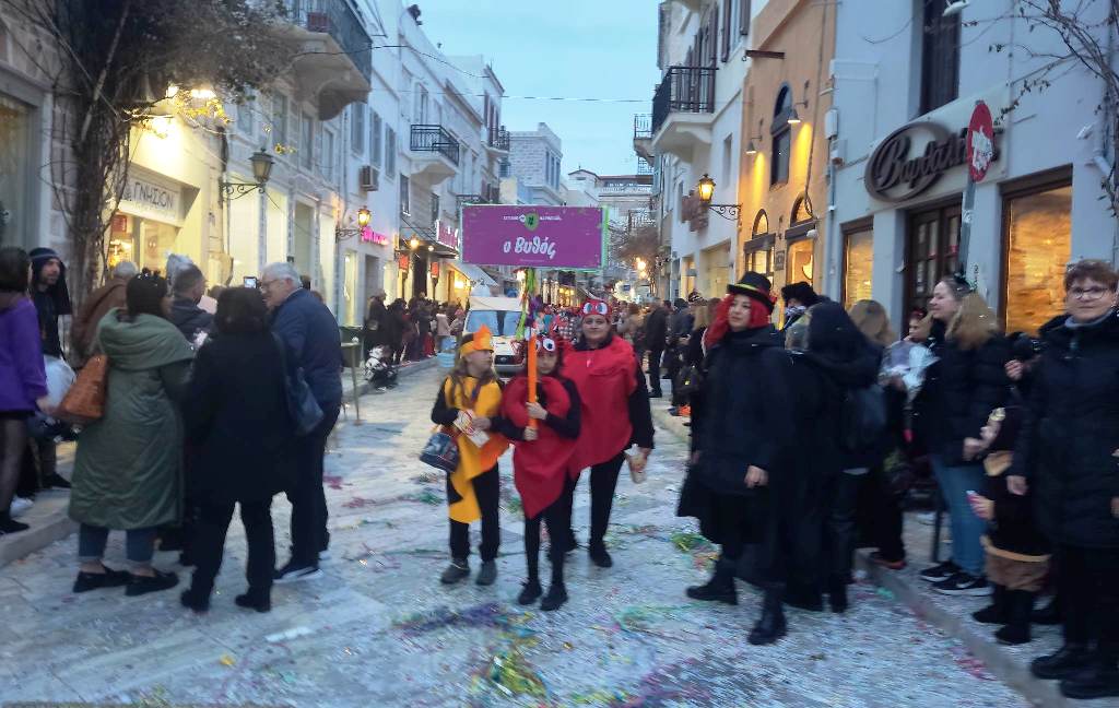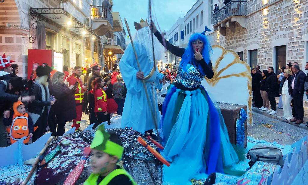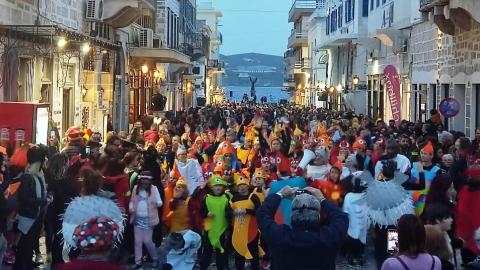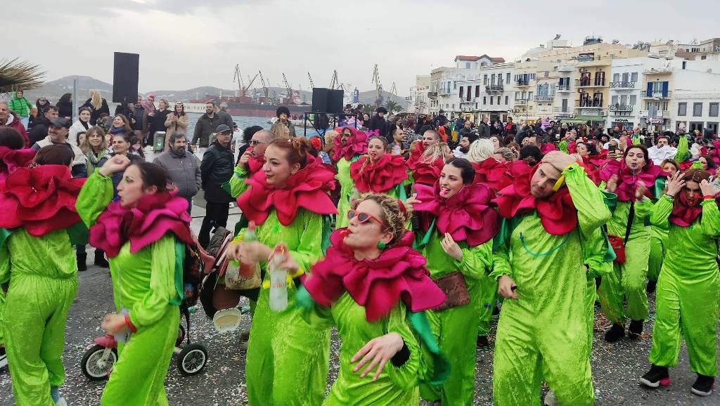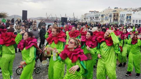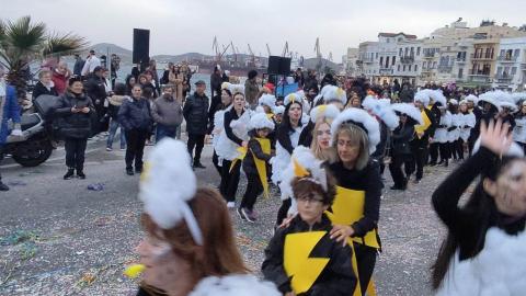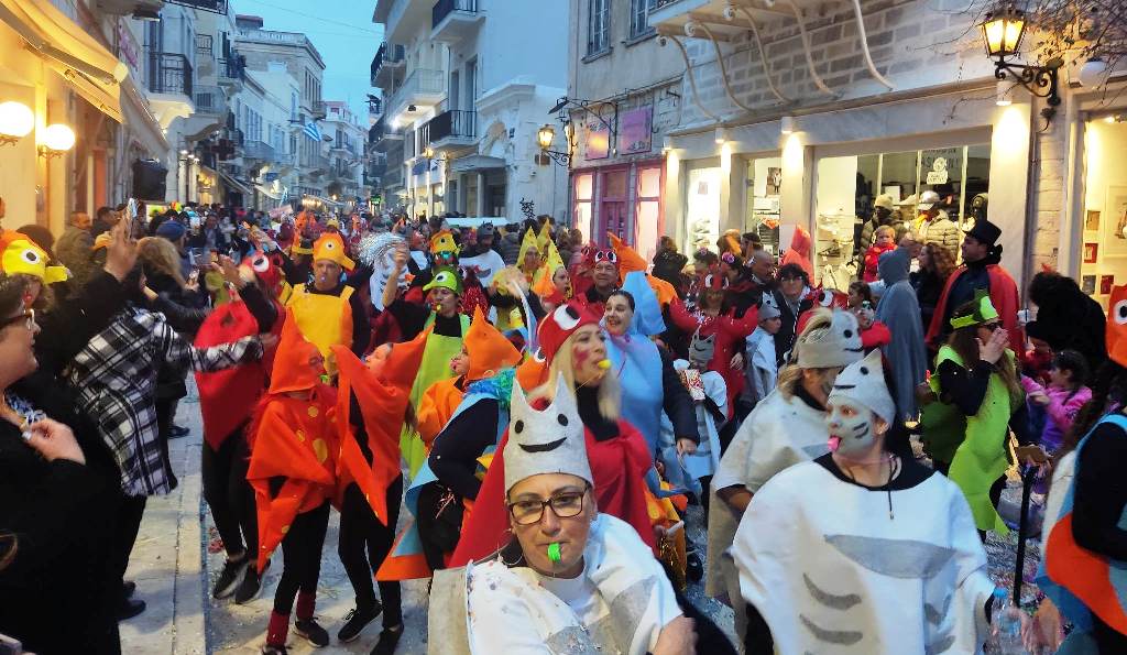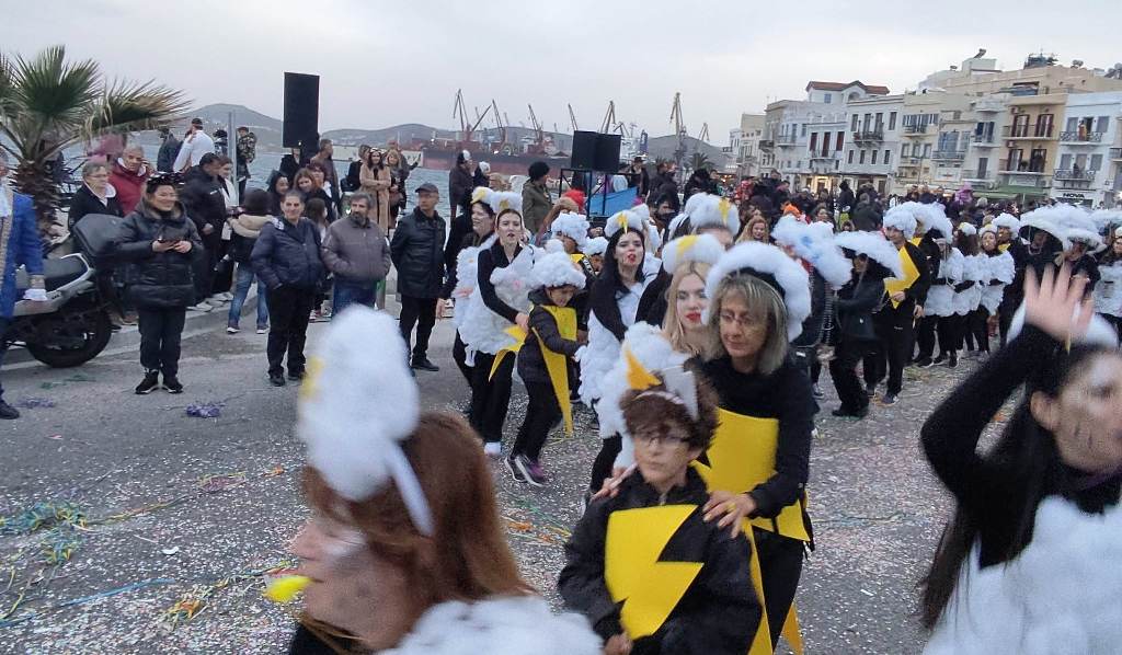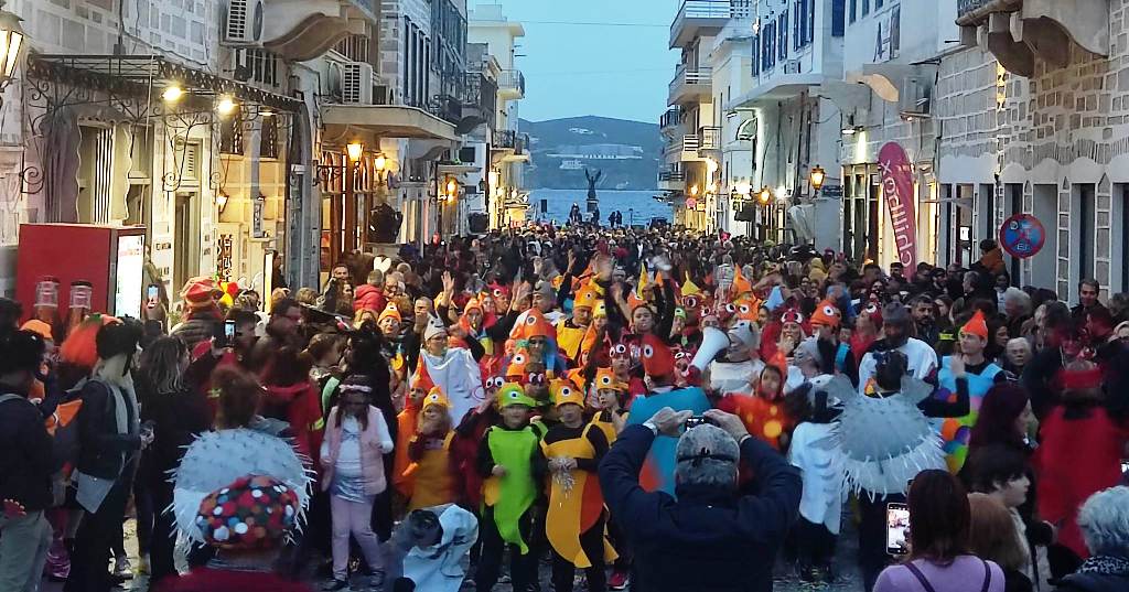 Τελευταία Κυριακή της Αποκριάς και η καρναβαλική παρέλαση στην Ερμούπολη βρίσκεται σε εξέλιξη, με πλήθος κόσμου να έχει πλημμυρίσει το κέντρο της πόλης, δίνοντας μία νότα χαράς και αισιοδοξίας.